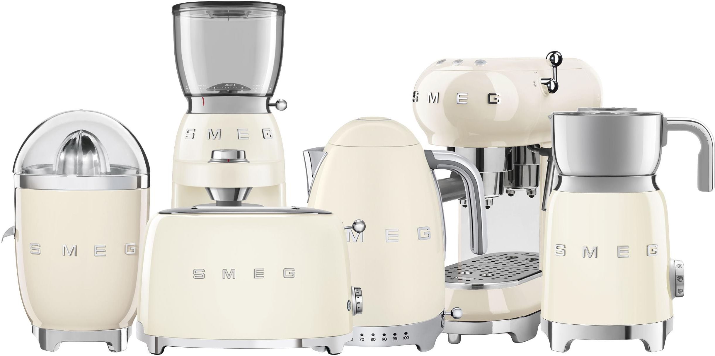 Zestaw śniadaniowo-kawowy 50's Retro Style w kolorze kremowym. W zestawie czajnik z regulacją temperatury, toster na 2 kromki, ekspres, młynek do kawy, spieniacz i wyciskarka.