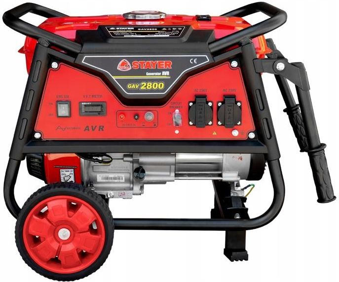 Agregat prądotwórczy Stayer GAV 2800 E AVR - 2 gniazda 230v BARDZO DOBRY HISZPAŃSKI AGREGAT !!! Przenośny generator prądu to zespolone urządzenie, którego głównymi elementami są silnik spalinowy oraz prądnica. Zasilany powszechnie dostępnym paliwem zamienia moc uzyskaną z pracy silnika poprzez prądnicę na energię elektryczną. Model GAV2800E posiada moc znamionową 2500W i moc maksymalną (krótkotrwałą) 2800W, wyposażony jest w 2 gniazda 230V, automatyczny regulator napięcia wyjściowego AVR oraz koła i uchwyty transportowe. Generator prądu stosuje się jako źródło zasilania wszędzie tam, gdzie nie ma stałych dostaw prądu lub następują przerwy w dostawach prądu. Do najczęstszych zastosowań generatorów zalicza się zasilanie maszyn i elektronarzędzi. Generatory wykorzystuje się w usługach, rzemiośle, budownictwie czy ogrodnictwie. Zalety Sinusoidalne wyjście AVR. Bezpieczne połączenie z dowolnym typem urządzenia bez szkodliwych przepięć. Małe zużycie paliwa. Wskaźnik napięcia. Kabel połączeniowy do wyjścia DC. Składany uchwyt. standardowe wyposażenie Kabel połączeniowy do wyjścia DC. Zapasowa świeca zapłonowa. Śrubokręt. Klucz do świec zapłonowych. Stabilizacja Napięcia AVR - tak. Napięcie znamionowe 230V Liczba gniazd 1-fazowych 2 x 230v Prąd znamionowy 11A Moc znamionowa 2,5 kW Maksymalna moc 2,8 kW Wyjście DC, napięcie 12 Vdc Wyjście prądu stałego, ampery 4,2 A SILNIK Typ 4T OHV. Paliwo Benzyna bezołowiowa 95º Pojemność skokowa 196 cm3 Start ręczny Moc maksymalna (silnik) 9 KM pojemność paliwo (benzyna) 15L pojemność. Olej 0,6 l czas pracy 13 godz Poziom mocy akustycznej 98 dB (A) Wymiary 60,5x46x46,5 cm Waga 50 kg Wyjścia x 2 Jednofazowe