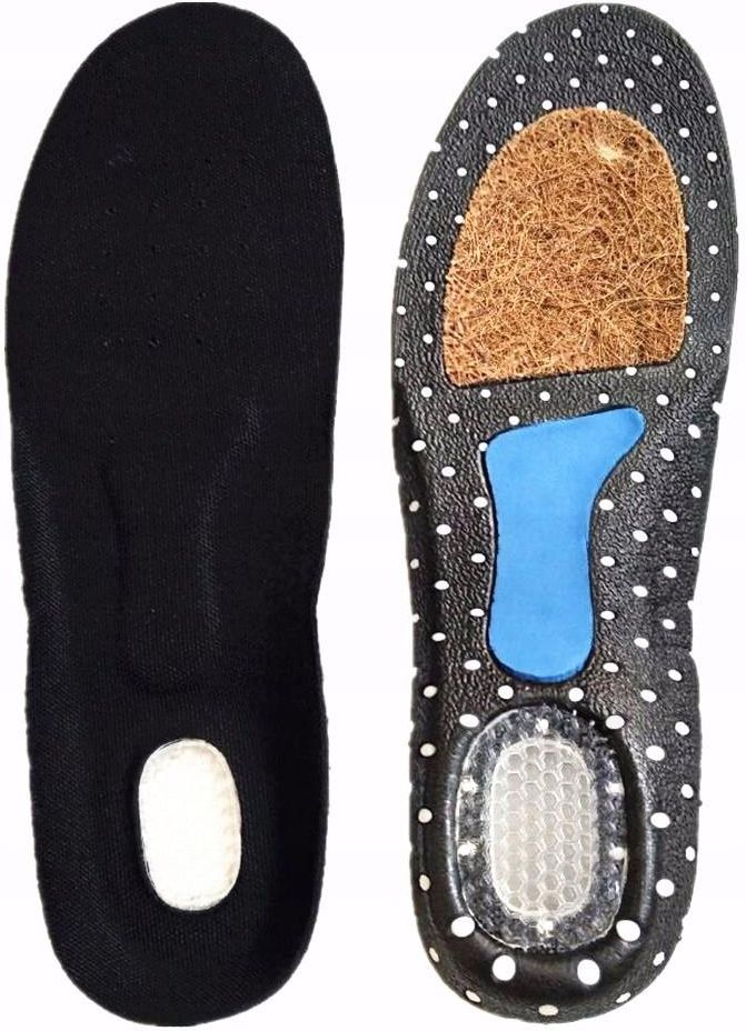 WKŁADKI DO BUTÓW Z ŻELEM I KOKOSEM PRZECIWPOTNE ROZMIAR 35-40 (do przycięcia) Wkładki do butów wykonane z wysokiej jakości dwuwarstwowego poliuretanu. W części piętowej nakładka żelowa doskonale tłumiąca drgania i ułatwiająca chodzenie bez zmęczenia. W środkowej części są tak wyprofilowane aby utrzymywały stopę w naturalnej pozycji zapobiegając płaskostopiu. Chłonące wilgoć włókna bambusowe w przedniej części wkładki zwiększają oddychalność oraz komfort stopy. Zmniejszają uczucie zmęczenia nóg i stóp oraz bolących pięt tzw. "ostrogi". Wkładki przeznaczone dla osób chcących poprawić wygodę i komfort podczas całego dnia pracy, stojąc czy chodząc, uprawiając sport. Zalety wkładek: lekkie dzięki zastosowaniu sprężystej dwuwarstwowego poliuretanu świetnie amortyzują podczas chodzenia wyprofilowanie anatomiczne utrzymuje stopę we właściwej pozycji Idealne w przypadku gdy występują problemy : z piętami, ostrogami potliwością stóp zmęczenia nóg