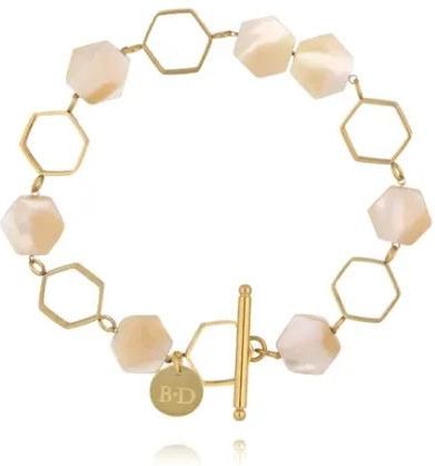 Bransoletka z plastrami miodu z masy perłowej Bransoletka By Dziubeka BSC2288. Geometryczne piękno i naturalny blask w jednym. Ta bransoletka łączy nowoczesny design sześciokątnych ogniw z elegancją perłowych elementów. Złote wykończenie nadaje całości luksusowego charakteru, a zapięcie typu toggle dodaje stylowego akcentu. Doskonała do minimalistycznych looków, na ważne wyjścia lub jako wyjątkowy prezent dla miłośniczki ponadczasowej elegancji. Surowiec: stal szlachetna. Kolor surowca: złoty. Wielkość elementów: 0,94 cm – 1,02 cm. Elementy: masa perłowa. Długość bransoletki: 17 cm. Zapięcie przekładane przez sześciokąt.