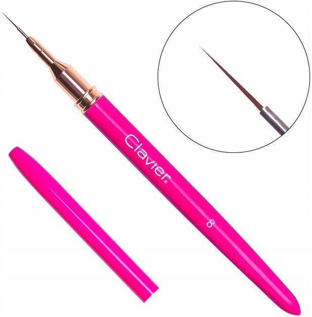 Clavier Pędzelek Magenta 02 - Do Zdobień 8 mmPędzelek do zdobień MAGENTA, to profesjonalny pędzelek do zdobień, niezastąpiony w branży stylizacji paznokci. Wysokiej jakości włosie gwarantuje trwałość i precyzję w malowaniu i zdobieniach paznokci. Jego wszechstronność, umożliwia pracę zarówno z żelem, akrylem, jak i lakierami.Skonstrukowany, aby precyzyjnie wykonywać wszelkiego rodzaju zdobienia i ułatwiać nakładanie ozdób, ten pędzelek jest kluczowy do tworzenia złożonych wzorów i zdobień na paznokciach. Jest niezbędny dla profesjonalistów w branży stylizacji paznokci, którzy dążą do doskonałych rezultatów i zadowolenia swoich klientek. pędzelek do zdobień MAGENTA, 8 mm precyzyjny w zdobieniu paznokci i malowaniu detali na płytce paznokcia pędzelek wykonany z włosia syntetycznego dedykowany do ultracieńkich linii i krawędzi pędzelek do zdobień doskonale wyważony i dobrze leży w dłoni doskonały design pędzelka przyciąga uwagę klientek i doda elegancji do Twojej pracy Zalety pędzelka do zdobień MAGENTA Clavier: Wysoka sprężystość włosia syntetycznego: włosie syntetyczne jest trwałe i elastyczne, co pozwala na precyzyjne malowanie i tworzenie drobnych detali na paznokciach, Rozmiar 8 mm: rozmiar 8 mm to idealna wielkość dla osób, które potrzebują pędzla o ultracieńkich linii i krawędziach. Ten rozmiar pozwala na dokładne konturowanie i zdobienie paznokci, Wyważenie i ergonomiczny design: dobrze wyważony pędzel oraz jego ergonomiczny kształt sprawiają, że jest wygodny w użyciu i leży dobrze w dłoni, co ułatwia precyzyjne malowanie, Estetyczny design: doskonały design pędzla przyciąga uwagę klientek i może dodać elegancji Twojej pracy, co jest ważne w branży manicure, Wyjątkowa przydatność: ten pędzel jest doskonały do tworzenia skomplikowanych wzorów i detali na paznokciach, co jest niezbędne w profesjonalnej stylizacji paznokci.