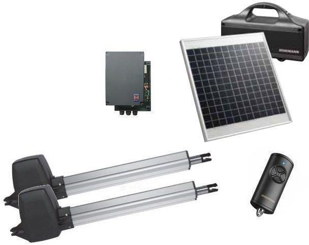 Kompletny zestaw napędu RotaMatic Akku 2 serii 3 BiSecur do bramy skrzydłowej w skład którego wchodzi:dwa siłowniki RotaMatic 2 Akku serii 3 BiSecur (szerokość skrzydła bramy do 2500mm, ciężar bramy do 120 kg)centrala sterująca w oddzielnej obudowieakumulator AE 24 w obudowie z lakierowanego …