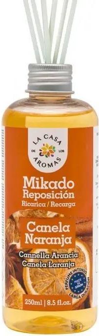 LA CASA DE LOS AROMAS Patyczki zapachowe CYNAMONOWO-POMARAŃCZOWY zapas, 250 ml Kolendra, imbir, goździki i gałka muszkatołowa pomagają nam w długie zimowe wieczory i przywracają wspomnienia ciepłych i ujmujących świątecznych wieczorów. Nuty zapachowe Nuta głowy: cynamon, korzenie, cytrusy, pomarańcza. Nuty ciała: goździki, eukaliptus, kwiaty, aldehyd, litsea, zieleń. Nuty bazy: słodki, wanilia, balsamiczny, kwiatowy, róża. Sposób użycia Napełnij swój zwykły pojemnik Mikado XL wkładem Mikado. Umieść nowe patyczki w pojemniku, aby wchłonąć i uwolnić zapach w całym pomieszczeniu. Umieść w wentylowanym miejscu, aby lepiej rozprowadzić aromat w całym pomieszczeniu. Jeśli chcesz zwiększyć intensywność, możesz odwrócić pręty. Jeśli nie masz pojemnika, możesz umieścić pręty bezpośrednio w pojemniku zastępczym. Aby to zrobić, należy odkręcić korek, nacisnąć u góry, aby zdjąć podkładkę, ponownie zakręcić nakrętkę, a na koniec założyć sztyfty.