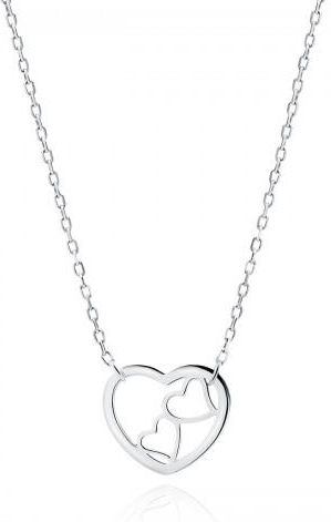 Subtelny, pełen wdzięku naszyjnik typu celebrytka z wysokiej jakości srebra próby 925. Piękny wzór delikatnego łańcuszka z ciekawym detalem pod postacią dwóch mniejszych serduszek zawartych w jednym większym. Naszyjnik ten będzie pięknym i oryginalnym prezentem dla każdej wyjątkowej osoby. Długość naszyjnika: regulowana od 42cm do 45cm Wymiary zawieszki: 12mm x 11mm Średnica łańcuszka: 1mm Kolor: Srebrny Materiał: Srebro próby 925 Waga: 1,6g Zapięcie: Karabińczyk