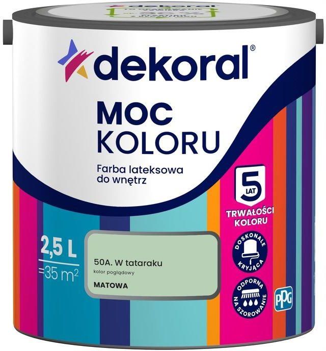 DEKORAL Farba Lateksowa Odporna na Ścieranie MOC KOLORU 2,5l Kolor: KARAIBSKA ZILEŃ 48A Farba lateksowa o podwyższonej odporności na szorowanie, przeznaczona jest do dekoracyjnego malowania ścian i sufitów wewnątrz pomieszczeń. Pozostawia matowy efekt wykończenia. Innowacyjna technologia produkcji pozwoliła na uzyskanie bardzo trwałej oraz odpornej na szorowanie farby o niespotykanie trwałych kolorach. WŁAŚCIWOŚCI wysoka wydajność – do 14 m2 z litra super krycie długotrwały efekt kolorowych ścian odporna na szorowanie, lateksowa umożliwia prawidłowe "oddychanie" ścian duża gama kolorystyczna Emulsję można aplikować na powierzchnię za pomocą pędzla, wałka lub pistoletu natryskowego. W celu uzyskania oczekiwanego efektu, zaleca się stosowanie 1 - 2 warstw farby. Narzędzia wykorzystane podczas malowania czyści się szybko i wygodnie, wystarczy umyć je ciepłą wodą. WYDAJNOŚĆ: To Farba o bardzo wysokiej wydajności, 1 l wystarcza na pomalowanie 14 m2 powierzchni. Farba lateksowa o podwyższonej odporności na szorowanie, przeznaczona jest do dekoracyjnego malowania ścian i sufitów wewnątrz pomieszczeń. Pozostawia matowy efekt wykończenia.