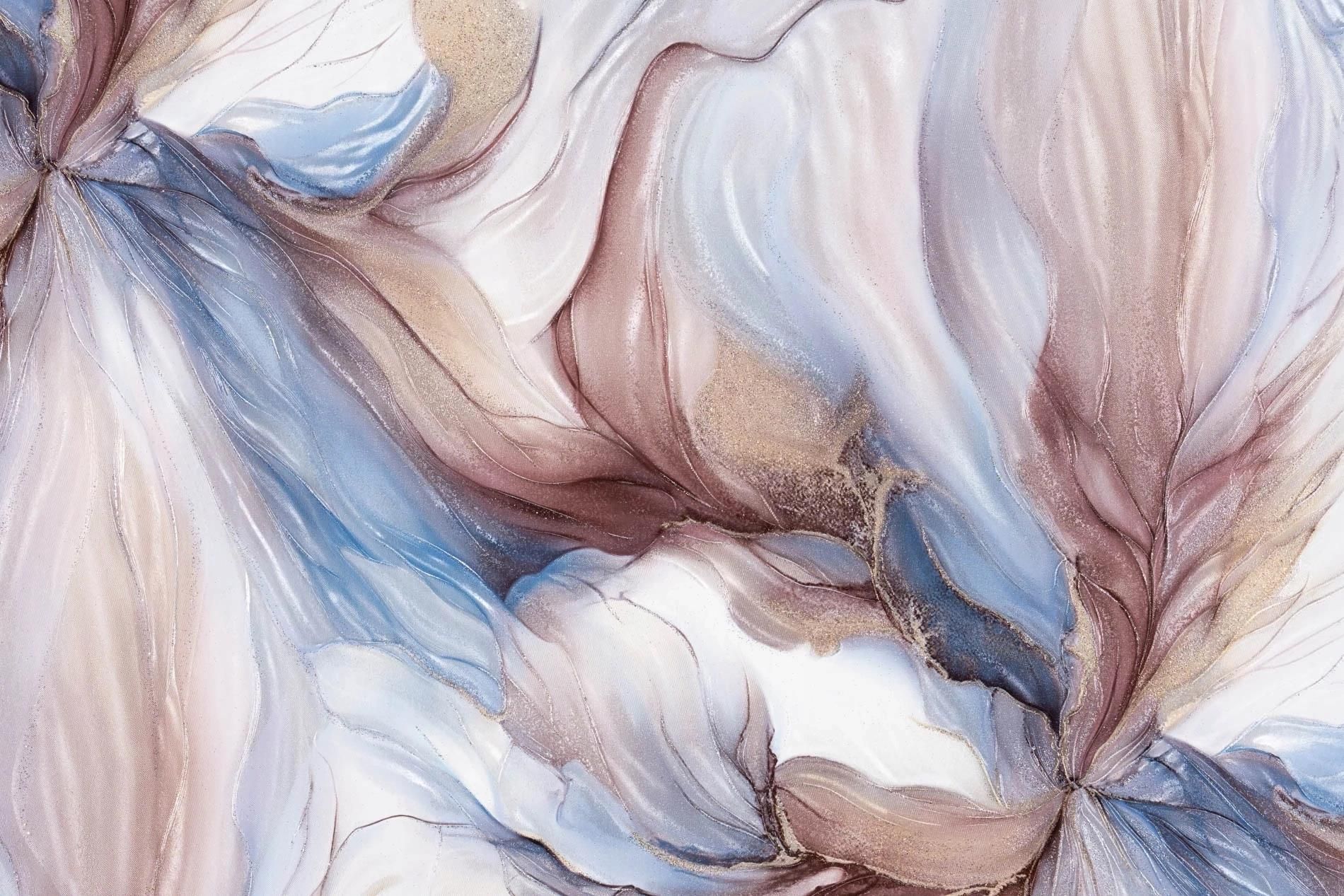 Tapeta przedstawia abstrakcyjną kompozycję, przypominającą nieco rozmyte płatki kwiatów lub organiczne kształty. Dominują pastelowe i stonowane odcienie błękitu, beżu, różu i fioletu. Kolory płynnie przechodzą jeden w drugi, tworząc miękki efekt ombre. Wzór zawiera złote lub srebrne, połyskujące …
