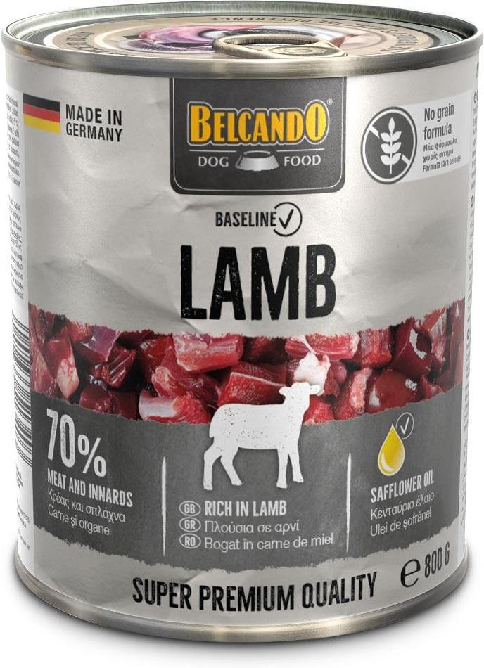 BELCANDO Baseline Jagnięcina 800g PEŁNOPORCJOWA KARMA DLA PSÓW SKŁADMięso jagnięce, serce, płuco, śledziona, nerki, flaki (26%); Bulion mięsny (28,8%); Mięso; Wątroba; Żołądek; Serce; Nerki; Płuco; Skorupki jaj, suszone; Minerały; Olej szafranowy (0,2%) SKŁADNIKI ANALITYCZNEBiałko 11,5%; Zawartość …