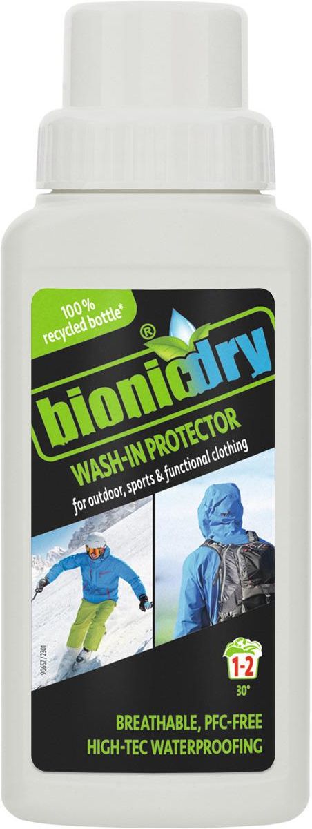 Wash In Protector to jedyny taki na rynku ekologiczny płyn do impregnacji odzieży o 100% biodegradowalności (pełną biodegradowalność płynu potwierdza certyfikat cradle-to-cradle). Dzięki zaawansowanej technologicznie formule impregnacji na bazie biologicznego chitozanu (naturalny środek powierzchniowo czynny), płyn Bionicdry zapewnia wysokowydajną impregnację, zachowując pełną oddychalność i funkcjonalność tkanin technicznych i ich membran. Bionicdry Wash In Protector można stosować także do impregnacji materiałów Gore-Tex. Impregnat nie zawiera żadnych substancji chemicznych w tym szkodliwych fluorowęglowodorów. Jak każdy produkt Bionicdry, taki i impregnat w płynie ma oznaczenie PFC Free. Co oznacza, że teraz bez obaw możesz możesz nosić impregnowane tkaniny bezpośrednio na ciało. Bionicdry zapewnia długotrwałą ochronę przed wilgoci podczas deszczu i śniegu, idealnie sprawdza się do użytku na tekstyliach outdoorowych i sportowych. Ochrona impregnatu jednak wraz z użytkowaniem stopniowo zanika, dlatego impregnacja powinna być od czasu do czasu odświeżana, by cieszyć się w pełni hydrofobowymi właściwościami impregnowanej odzieży lub sprzętu outdoorowego. Impregnat nadaje się do wszelkich materiałów sportowych i funkcjonalnych, w tym delikatnych tkanin membranowych, butów, plecaków, namiotów, markiz, kombinezonów narciarskich etc. Na szczególną uwagę zasługuje fakt, że producent marki Bionicdry, firma Werner & Mertz jako jedyna na rynku impregnatów i środków piorących dobrowolnie przystąpiła do certyfikacji EMAS. Co oznacza, że wszystkie procesy, obiekty, produkcja i logistyka są corocznie sprawdzane i audytowane przez niezależnego audytora środowiskowego. Firma osiągnęła także kolejny kamień milowy w inicjatywie Recyclate na rzecz gospodarki o obiegu zamkniętym. Butelki środków i impregnatów Bionicdry wykonane są w 100% z recyklatu poużytkowego, czyli wykonane w 100% z recyklingu odpadów konsumenckich.