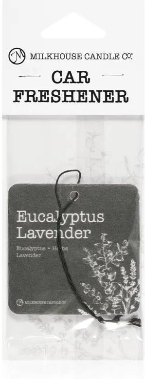 Milkhouse Candle Co. Creamery Eucalyptus Lavender, 1 szt., Zapachy do samochodu Zapachy do domu, Zawieszka zapachowa do samochodu Milkhouse Candle Co. Creamery Eucalyptus Lavender to idealny dodatek do wypełnienia przyjemnym zapachem wnętrza samochodu lub niewielkich pomieszczeń. Dzięki praktycznej pętelce zawiesisz ją w pożądanym miejscu i podczas całej jazdy będziesz się cieszyć jej przyjemnym aromatem. Właściwości: świeży zapach