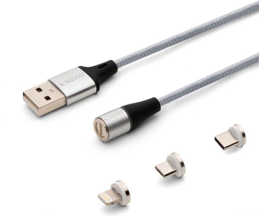 Savio Kabel magnetyczny USB - USB Typ C Micro i Lightning Srebrny 2m (CL-156) Strzelin