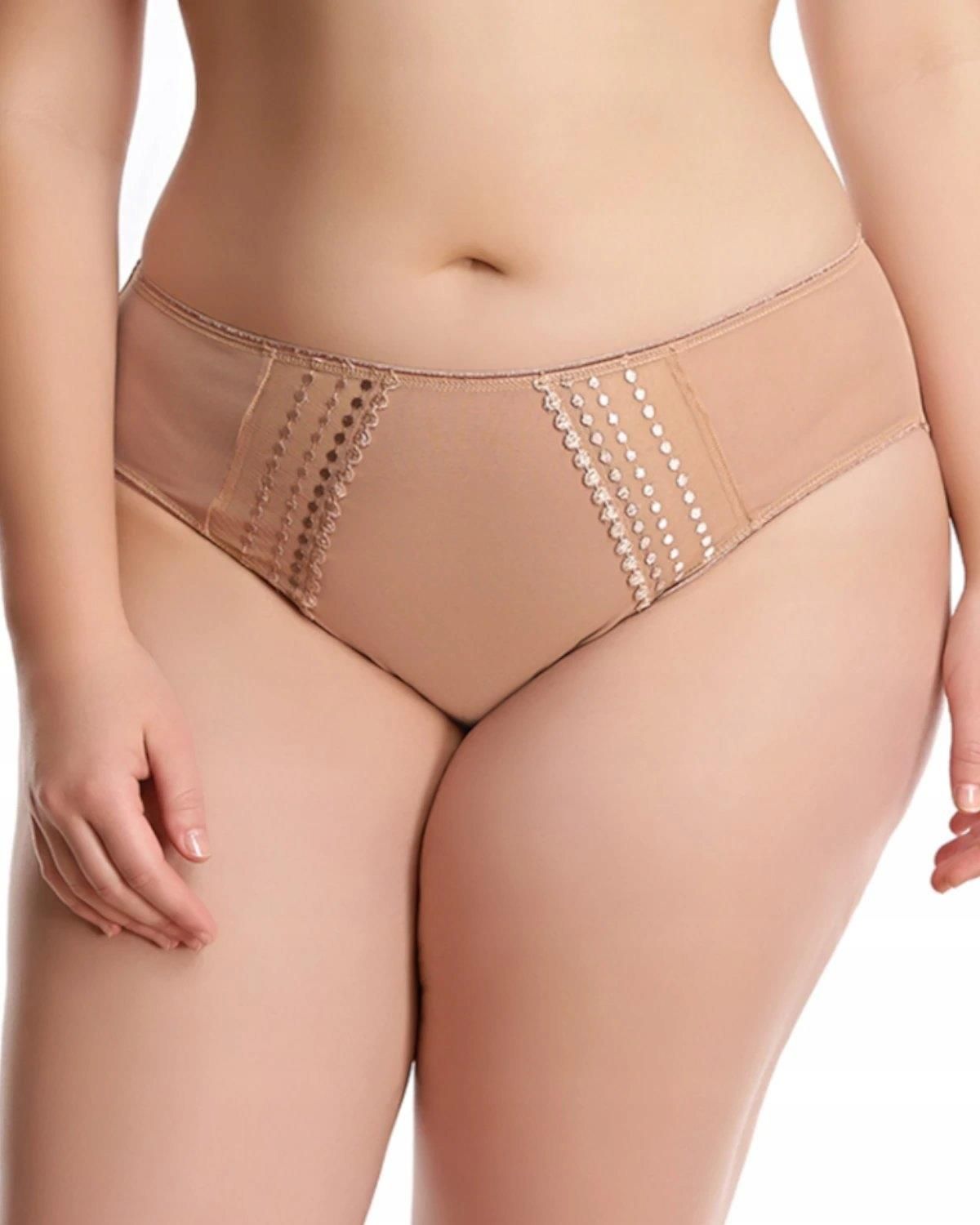 Matilda figi - beżowe Rozmiar sprzedawanego produktu znajdziesz w tytule aukcji! Kolor: beżowy / cielisty Krój: figi Nadruk: nie Haft: wstawki Koronka: nie Skład materiałowy: 63% nylon 31% bawełna 6% elastan Zdobienia: z haftem Gwarancja: 24 miesiące Zalecenia: Pranie ręczne Figi renomowanego producenta Elomi. Figi zdobione przeźroczystym materiałem i delikatnym haftem w kropki W pasie elastyczna gumka, która zapewnia idealne dopasowanie i podtrzymanie majteczek.