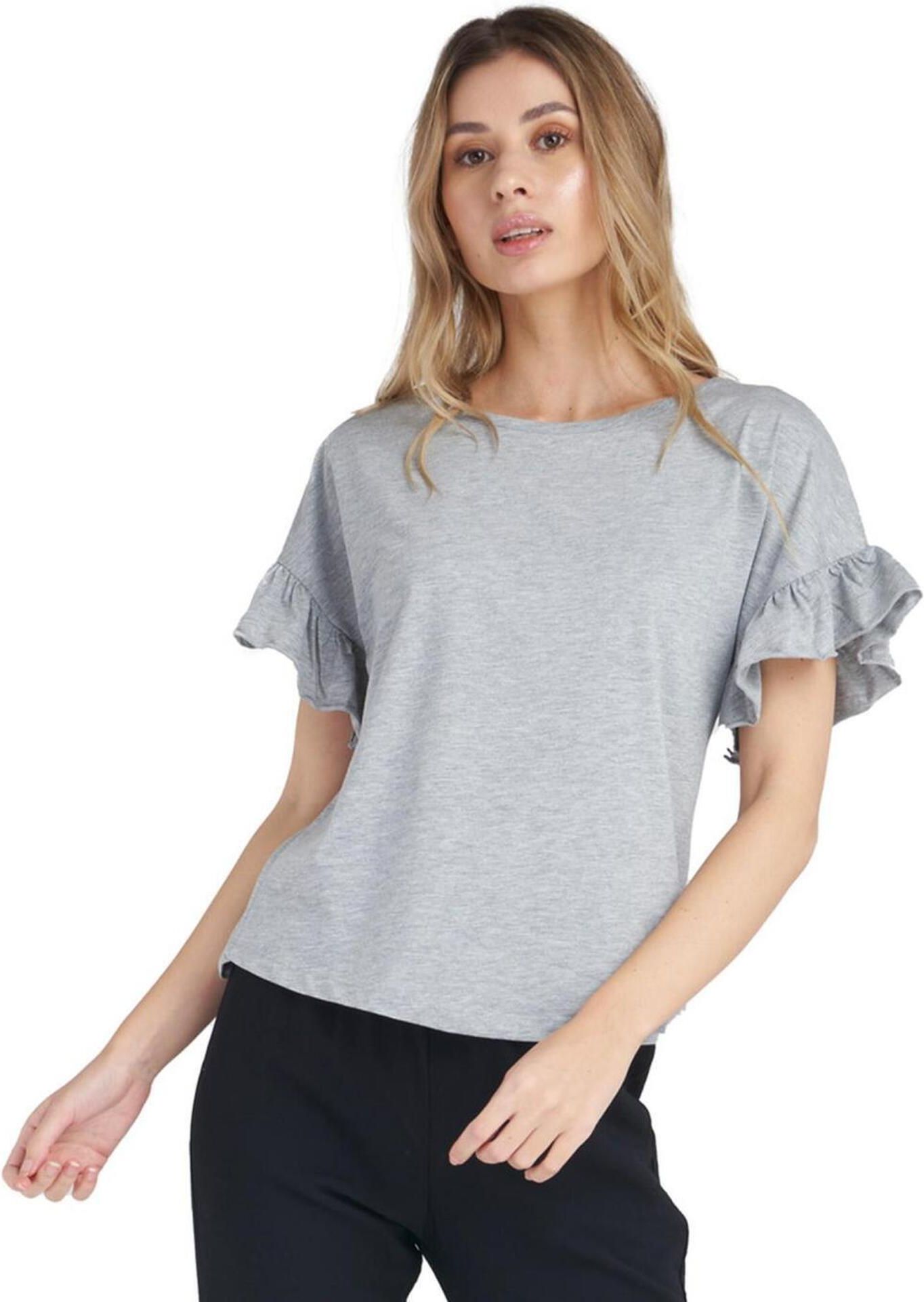 Błyszcząca damska koszulka z krótkim rękawem i falbaną Strzyżów
