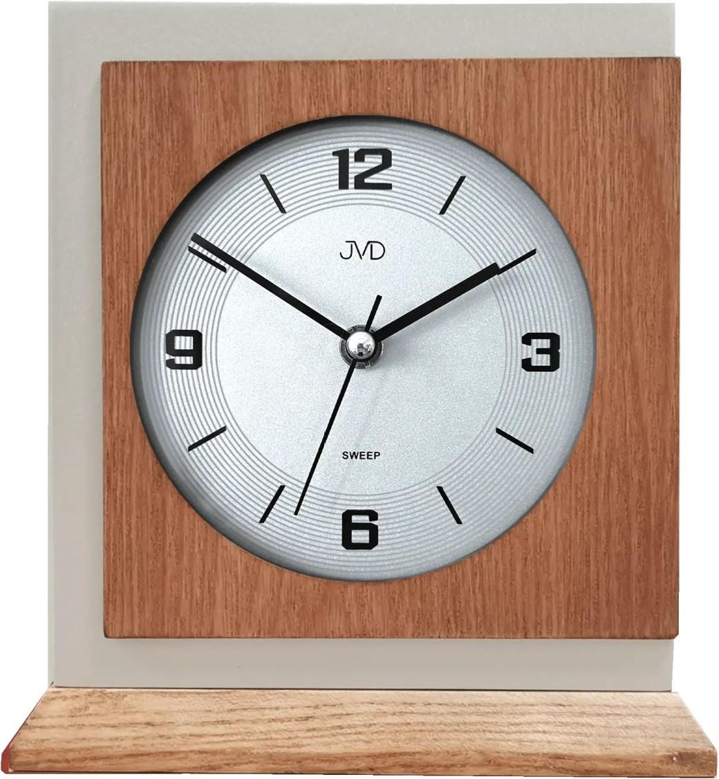 Brązowy prostokątny nowoczesny drewniany średniej wielkości zegar kominkowy biurkowy szafkowy JVD HS24013.78. Drewniana dwukolorowa obudowa, cichy mechanizm kwarcowy, czytelna tarcza. Wymiary 18,5 x 20 cm