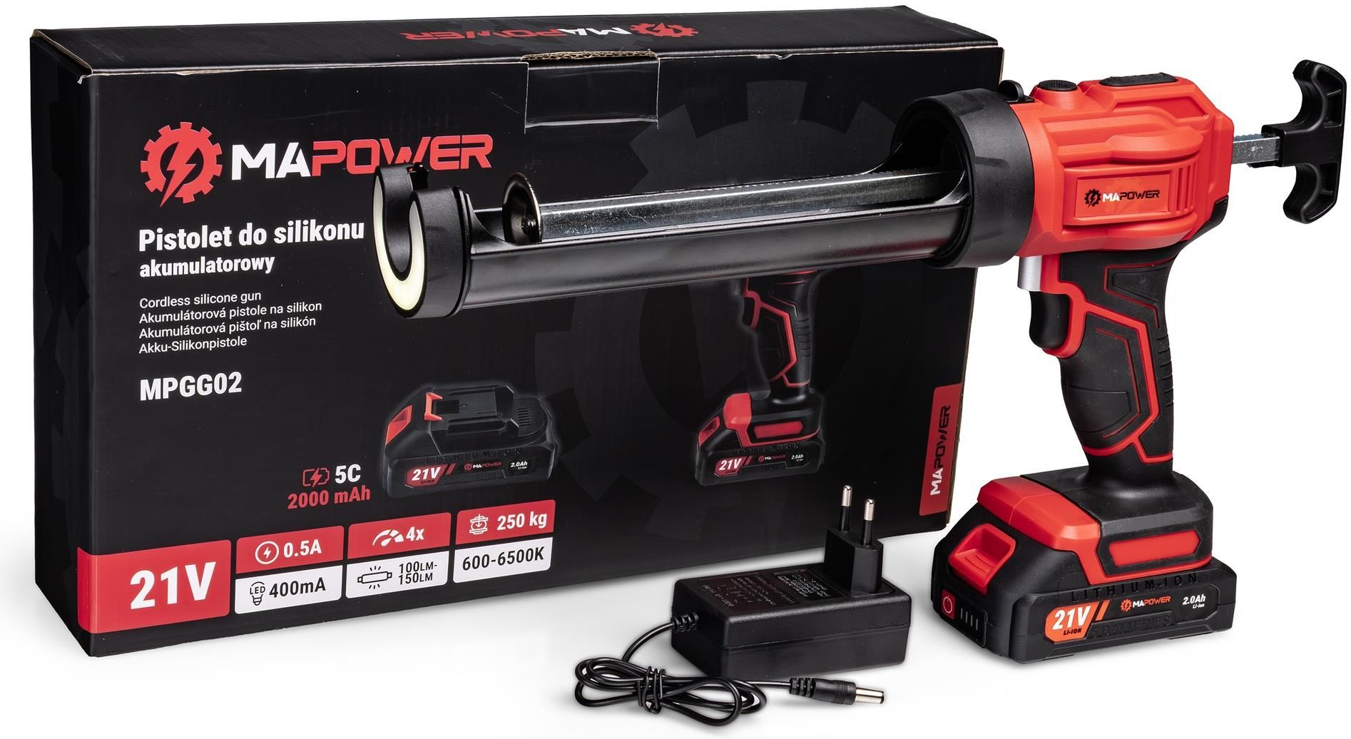 PISTOLET DO SILIKONU AKUMULATOROWY WYCISKACZ DO KLEJU MAS 2.0 AH MAPOWER ✅ Profesjonalne wykończenie w domowych warunkach PISTOLET DO WYCISKANIA SILIKONU MAPOWER MPGG01 to narzędzie, które pozwala szybko i precyzyjnie wyciskać SILIKON, KLEJE i MASY USZCZELNIAJĄCE bez wysiłku. Dzięki ZASILANIU AKUMULATOROWEMU I LEKKIEJ KONSTRUKCJI z łatwością uszczelnisz wannę, brodzik, okna czy drzwi, a także wykonasz estetyczne łączenia w kuchni, łazience i podczas montażu mebli. Wbudowana lampa LED ułatwia pracę w słabo oświetlonych miejscach, a ergonomiczny uchwyt zapewnia wygodę nawet przy długim użytkowaniu. Co zyskujesz: OSZCZĘDZA CZAS dzięki automatycznemu podawaniu silikonu, PRACUJESZ BEZ WYSIŁKU – koniec z bolącą dłonią po kilku minutach, RÓWNE I CZYSTE WYKOŃCZENIE bez nadmiaru masy, PRECYZYJNE WYCISKANIE w trudno dostępnych miejscach. Dane techniczne: Marka: MAPOWER Model: MPGG02 Napięcie znamionowe: 21 V Zasilanie: akumulator Li-ion Pojemność akumulatora: 2.0 Ah 5C Czas pracy na baterii: do 240 minut (do 100 tub) Szybkość wyciskania: I: 87-96 mm/min II: 125-135 mm/min III: 162-178 mm/min IV: 195-220 mm/min Maksymalna wielkość tuby: do 220 mm długości, 50 mm średnicy Maksymalna pojemność tuby: do 300 ml Maksymalna siła wyciskania: do 250 kg Oświetlenie LED: Tak, 100-150 lm Waga urządzenia bez baterii: 1.03 kg Waga urządzenia z baterią: 1.41 kg Wyposażenie: akumulator 2.0 Ah, ładowarka, instrukcja obsługi w języku polskim, oryginalne opakowanie producenta ✅ Pistolet do wyciskania silikonu do zadań specjalnych! Pistolet doskonale poradzi sobie z wyciskaniem i nakładaniem różnego rodzaju mas: SILIKONU AKRYLU KLEJÓW BUDOWLANYCH KOTWY CHEMICZNEJ MAS USZCZELNIAJĄCYCH i podobnych tego typu substancji. ✅ Dłuższa praca bez przerw dzięki zasilaniu akumulatorowemu Pistolet do wyciskania silikonu został wyposażony w wydajny AKUMULATOR LITOWO-JONOWY o pojemności 2 Ah i napięciu 21 V. Takie rozwiązanie zapewnia długi czas pracy i doskonałą wydajność. Jedno ładowanie akumulatora wystarcza nawet na 240 MINUT PRACY (czyli do 100 tub silikonu lub kleju), co pozwala spokojnie dokończyć cały projekt bez konieczności przerywania pracy. WSKAŹNIK NAŁADOWANIA na akumulatorze pozwoli Ci w każdej chwili sprawdzić aktualny poziom energii – dzięki temu wiesz, kiedy doładować sprzęt i unikniesz niespodziewanego przestoju w pracy. ✅ 4-stopniowa regulacja prędkości – dopasuj tempo wyciskania do rodzaju pracy ► Pistolet akumulatorowy wyposażono w 4-STOPNIOWĄ REGULACJĘ PRĘDKOŚCI WYCISKANIA, która pozwala idealnie dostosować tempo pracy do gęstości masy i rodzaju zastosowania. ► Niższe biegi zapewniają PRECYZJĘ I KONTROLĘ, a wyższe – MAKSYMALNĄ WYDAJNOŚĆ I SZYBKIE TEMPO APLIKACJI przy dużych powierzchniach. I – 87–96 mm/min – do precyzyjnego, równomiernego nakładania przy drobnych wykończeniach i delikatnych spoinach. II – 125–135 mm/min – optymalna prędkość do standardowych zastosowań z silikonami i klejami. III – 162–178 mm/min – większa wydajność i płynne nakładanie na dłuższych odcinkach. IV – 195–220 mm/min – maksymalna moc i tempo pracy, idealne do gęstych mas i dużych projektów. ► Taka regulacja pozwala Ci PRACOWAĆ DOKŁADNIE TAK, JAK POTRZEBUJESZ – od precyzyjnego wykańczania po szybkie nakładanie materiału w trybie pełnej mocy. ✅ 100 wyciśniętych tub na jednym ładowaniu akumulatora Na jednym ładowaniu akumulatora możesz WYCISNĄĆ NAWET 100 TUB po 300 ml, co daje aż 30 litrów materiału bez przerywania pracy. Wysoka wydajność akumulatora i mocny silnik pozwalają pracować nieprzerwanie nawet przez 4 godziny, zależnie od gęstości masy. Dzięki temu oszczędzasz czas, unikasz częstego ładowania i możesz realizować większe projekty w jednym cyklu pracy — SZYBCIEJ, WYGODNIEJ I BEZ ZBĘDNYCH PRZERW. ✅ Technologia SmartReverse – automatyczne cofanie tłoka dla czystej i precyzyjnej pracy Nowoczesny system SmartRevers to specjalnie zaprojektowana funkcja, która AUTOMATYCZNIE COFA TŁOK po zwolnieniu spustu. Dzięki temu pistolet natychmiast ZATRZYMUJE PRZEPŁYW MASY, zapobiegając jej niekontrolowanemu wyciekowi z dyszy. Efekt? Czystsza aplikacja, mniej strat materiału i perfekcyjnie zakończona spoina bez nadmiaru silikonu. ✅ Komfortowa praca bez wysiłku i zmęczenia dłoni ZAPOMNIJ O BÓLU DŁONI po kilku minutach pracy z ręcznym wyciskaczem. AUTOMATYCZNY MECHANIZM pistoletu do kleju MAPOWER samoczynnie dozuje silikon lub klej, zapewniając równomierne i stałe wyciskanie materiału. Nie musisz już męczyć się ze ściskaniem spustu ani z oporną tubą — po prostu umieść wkład z masą, wciśnij przycisk i zacznij pracę. ✅ Oświetlenie LED, abyś doskonale widział klejone miejsce Wbudowane OŚWIETLENIE LED precyzyjnie doświetla miejsce pracy, dzięki czemu dokładnie widzisz linię kleju lub silikonu nawet w słabo oświetlonych pomieszczeniach. ANTYPOŚLIZGOWA RĘKOJEŚĆ gwarantuje stabilny i pewny chwyt, co zwiększa precyzję aplikacji i bezpieczeństwo pracy. Solidna METALOWA RAMA nadaje pistoletowi sztywność i odporność na uszkodzenia, dzięki czemu narzędzie posłuży Ci przez długi czas – zarówno w domu, jak i w warsztacie. ✅ Dziecinnie prosta obsługa Włóż akumulator do gniazda w rękojeści, aż zatrzaśnie się na miejscu. Przygotuj tubę – odetnij końcówkę pod kątem 45° i przytnij dyszę do potrzebnej szerokości. Zamontuj tubę – pociągnij przycisk zwalniania ramy, obróć ramę o 90° i włóż tubę, aż się zablokuje. Ustaw prędkość odpowiednim przyciskiem (I–IV) w zależności od gęstości masy. Włącz oświetlenie LED, jeśli pracujesz w ciemnym miejscu. Naciśnij spust, aby rozpocząć wyciskanie – prowadź pistolet równym ruchem wzdłuż szczeliny. Gotowe! Zestaw zawiera: Pistolet do silikonu MPGG02 Akumulator Li-ion 2.0 Ah Ładowarka Instrukcja obsługi