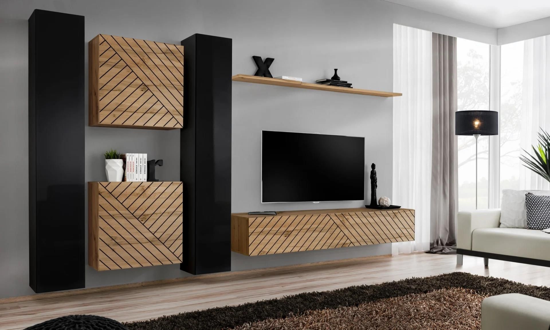 MEBLOŚCIANKA SWITCH VI LAMEL PVC Wymiary całkowite (S/W/G): ~330cm / 180cm / 40cm wszystkie szafki wiszące - zawieszki są regulowane na wysokość i głębokość powieszenia czarne frezy fronty mat i połysk PVC fronty otwierane na push-click nowoczesny design mebel do samodzielnego montażu w zestawie dołączona jest instrukcja montażu oraz wszystkie elementy montażowe (w tym kołki do zawieszenia mebli na zwykłej ścianie) bardzo łatwy montaż Zawartość zestawu: 2 x szafka wisząca WOTAN czarne frezy symbol: SW3-L wymiary (S/W/G): 60cm / 60cm / 30cm 2 x szafka wisząca korpus czarny mat/ front czarny połysk symbol: SW1 wymiary (S/W/G): 30cm / 180cm / 30cm szafka RTV WOTAN czarne frezy symbol: RTV1-L wymiary (S/W/G): 180cm / 30cm / 40cm półka WOTAN symbol: PW1 wymiary (S/W/G): 180cm /1,8cm / 20cm