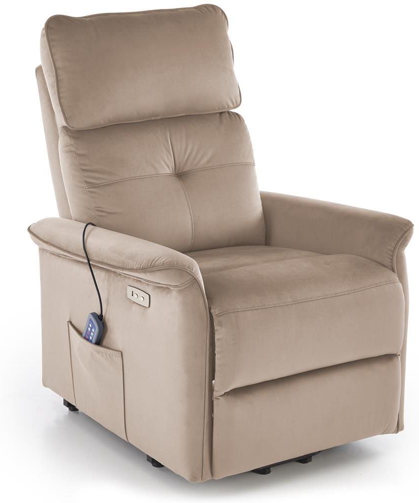 Fotel Masujący Wypoczynkowy Elektryczny do Masażu Beżowy Welurowy SEMIR 2 Fotel SEMIR 2 od Halmar Materiał: Tkanina velvet BLUVEL Kolorystyka: Beżowy (#40) Funkcje: Elektryczne rozkładanie, funkcja pionizacji, masaż, gniazdo USB Styl wykonania: Tradycyjny ZALETY Luksusowa tapicerka z velvetu - …