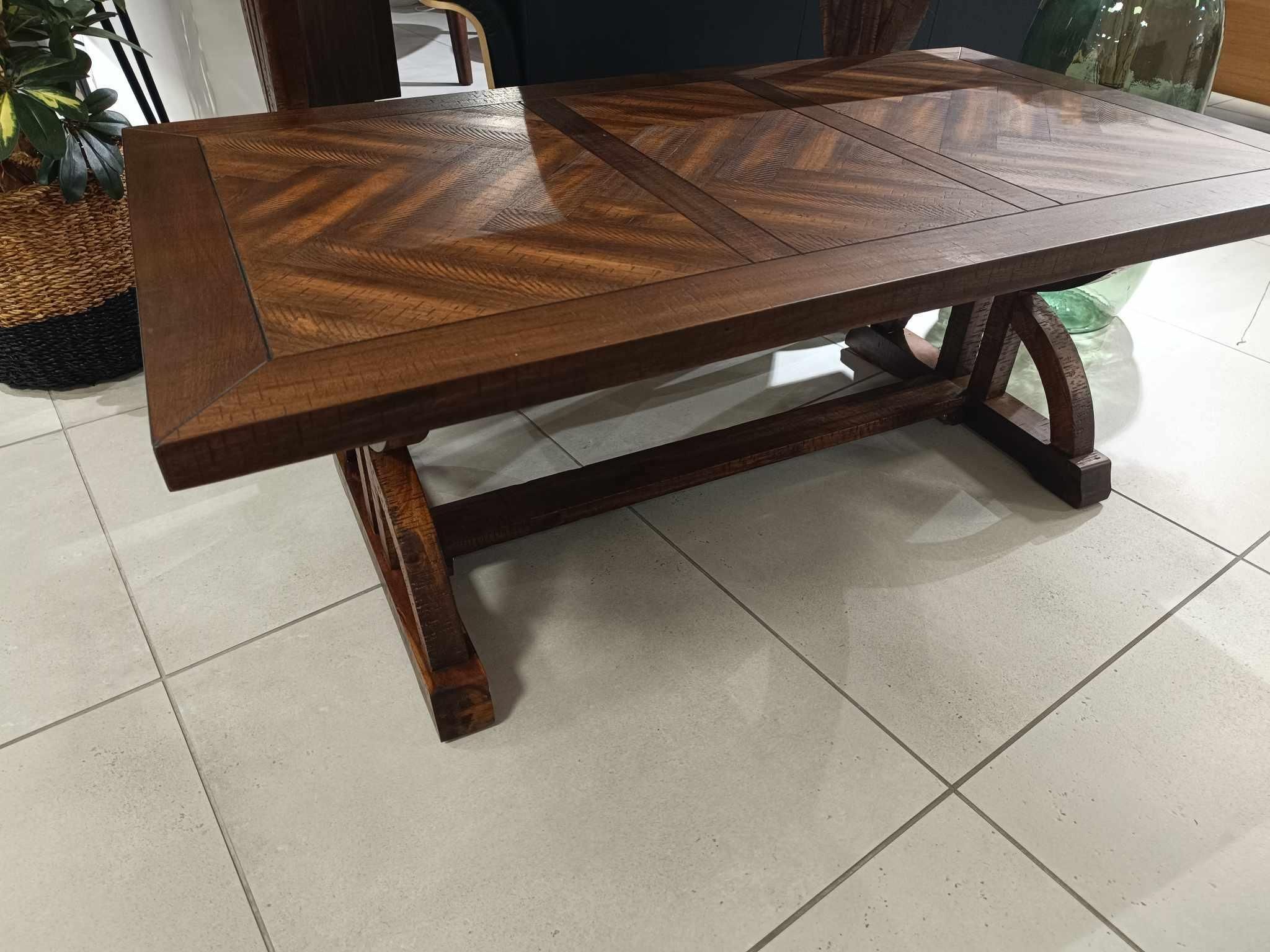 Masywna i stabilna ława wykonana z naturalnego drewna akacji w kolorze ciemnobrązowym. Blat w kształcie prostokąta z intarsją. Towar poekspozycyjny, posiada uszczerbienie na blacie.