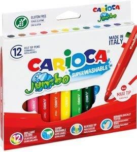 Mazaki flamastry Jumbo 12 kolorów Flamastry Carioca Jumbo to zestaw 12 mazaków stworzony z myślą o małych rękach i wielkich artystach. Grube, ergonomiczne trzonki zapewniają doskonały chwyt, a wysokiej jakości atrament gwarantuje intensywne kolory. Bezpieczne dla dzieci, łatwo zmywalne z większości tkanin. Idealne do rysowania, malowania i kolorowania. Wybierz Carioca Jumbo i pozwól dzieciom odkryć świat kreatywności w pełni kolorów! poliestrowa końcówka o grubości 4,5 mm końcówka wyposażona w blokadę – nie ma możliwości wciśnięcia jej do środka wysokiej jakości tusz na bazie wody tusz łatwy do usunięcia ze skóry lub tkaniny za pomocą samej wody bezpieczna wentylowana zatyczka umożliwia oddychanie w przypadku połknięcia zgodne z normą CE grubość linii 2-3,5 mm 12 kolorów