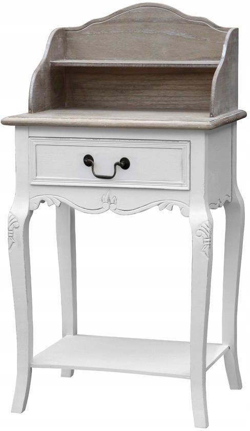 Rimini White 115 Szafka z nadstawką prowansalska biała z brązowym przecieranym blatem drewno/mdf Biała szafka z jedną szufladą, jedną półką oraz nadstawką na blacie. Szafka ma gięte nóżki oraz ozdobne rzeźbienia. Może pełnić funkcję małego sekretarzyka. Wymiary Szerokość (cm): 49 Wysokość (cm): 94 Głębokość (cm): 36 Dane techniczne Waga (w kg): 8 Kolekcja: Rimini White Materiał: płyta MDF, drewno Kolor: Biały, blat brązowy bielony Montaż: Mebel zmontowany przez producenta wysokość nadstawiki: 27 cm Wymiar wewnętrzny szuflady: 35,5 x 27,5 x 10 cm głębokość półki w nadstawce: 11 cm Jeżeli zgadzasz się z opinią specjalistów od dekoracji wnętrz i wierzysz w moc detali, które tworzą charakter wnętrza, z pewnością docenisz urok niewielkiego mebla od LivinHill z kolekcji Rimini White, który wyjątkowym designem i widoczną jakością wykonania odmienia wnętrze. Szafka z nadstawką Rimini White wykonana jest z drewna i wysokiej jakości płyty MDF, co jest gwarancją trwałości na wiele lat. Charakterystycznym elementem mebla jest urocza nadstawka, która razem z szafką tworzy mini sekretarzyk. Poza funkcjonalną nadstawką szafka Rimini White posiada szufladę oraz półkę w dolnej części. Gięte rzeźbione nogi, świeży biały kolor mebla oraz postarzenia na całej powierzchni do cały urok mebli z tej wyjątkowej kolekcji. Szafka Rimini White odnajdzie swoje miejsce we wnętrzach tradycyjnych. Mebel w salonie lub sypialni w stylu rustykalnym, prowansalskim lub klasycznym doda wiele uroku. Jeżeli spodobał Ci się design szafki Rimini White, poznaj całą kolekcję i wyobraź sobie eleganckie i przytulne wnętrze, jakie możesz stworzyć, meblując swój dom elementami z tek kolekcji.