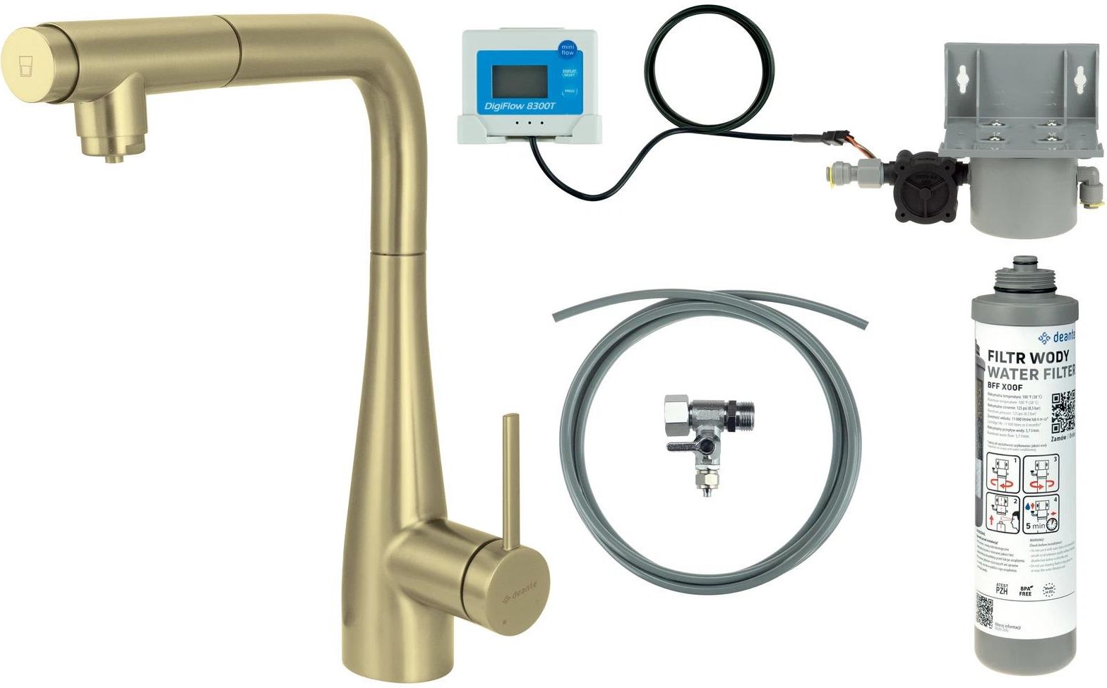 Bateria kuchenna DEANTE ERIDAN z zestawem do filtracji wody złoty szczotkowany BREFR75M Bateria kuchenna z zestawem do filtracji wody z wyciąganą wylewką Bateria kuchenna z systemem filtracji wody Eridan to wyjątkowe rozwiązanie, które łączy elegancję, funkcjonalność i troskę o zdrowie. Smukła forma baterii, wykończona w szczotkowanym złocie, nadaje kuchni wyrafinowanego charakteru. Subtelnie rozszerzający się ku dołowi korpus sprawia, że całość prezentuje się lekko i harmonijnie. To jednak coś więcej niż bateria – dzięki wbudowanemu systemowi filtracji Eridan staje się źródłem czystej i zdrowej wody. Wystarczy nacisnąć przycisk Click umieszczony na wylewce, aby jednym ruchem przełączyć się na wodę filtrowaną, dostarczaną oddzielnym wężykiem bezpośrednio z filtra. Takie rozwiązanie nie tylko eliminuje potrzebę stosowania dodatkowych dzbanków czy butelek, ale także pozwala zadbać o środowisko, ograniczając zużycie plastiku. Dołączony zestaw filtracyjny skutecznie usuwa chlor, metale ciężkie, piasek i inne zanieczyszczenia, poprawiając smak oraz zapach wody. Dzięki temu możesz bez obaw podawać ją rodzinie, używać do gotowania czy przygotowywania napojów. Praktyczny monitor wskazuje, kiedy należy wymienić wkład filtracyjny, co gwarantuje stałą jakość wody na co dzień. Montaż całego systemu jest szybki i prosty, a codzienne korzystanie z niego – intuicyjne i wygodne. Eridan to nie tylko elegancki element wyposażenia kuchni, ale przede wszystkim inwestycja w zdrowie i komfort. Łączy nowoczesną estetykę z ekologicznym podejściem i dbałością o detale, sprawiając, że Twoja kuchnia staje się miejscem jeszcze bardziej funkcjonalnym i wyjątkowym. Aerator: Typ aeratora - honeycomb Rozmiar aeratora - M24 Bateria: Materiał - stal 304 Wykończenie - złoty szczotkowany Rodzaj baterii - jednouchwytowa, mieszaczowa, do podłączenia filtra wody Sposób montażu - stojący Grupa akustyczna [dB] - I (x ≤ 20) Klasa przepływu [l/min] - Z - 4-9 l/min Wylewka: Materiał - stal nierdzewna Rodzaj wylewki - wyciągana Głowica do baterii: Rozmiar głowicy ceramicznej - 35 mm Wężyk przyłączeniowy: Długość [mm] - 600 Gwint od instalacji - 3/8" Monitorowanie przepływu wody Wyświetlacz to praktyczne urządzenie do monitorowania przepływu wody, które przede wszystkim alarmuje, gdy czas życia wkładu filtracyjnego dobiegnie końca – po 11 000 litrach lub 6 miesiącach. Dzięki temu zawsze wiesz, kiedy wymienić filtr, by woda pozostała czysta. Jest też prosty w montażu i działa na niskie napięcie 3 V DC, co czyni go energooszczędnym i wygodnym w użyciu. Potrójna filtracja wody Filtracja opiera się na trzech zaawansowanych technologiach, które razem skutecznie eliminują zanieczyszczenia wody. Usuwają chlor, pestycydy oraz piasek, jednocześnie poprawiając smak wody. Skutecznie redukuje obecność metali ciężkich i zapobiega rozwojowi bakterii, zapewniając wodę czystą i bezpieczną do codziennego użytku. Baterię można zamontować nawet bardzo blisko ściany Dźwignia odpowiedzialna za otwieranie przepływu wody w tej baterii posiada pełen zakres ruchu wyłącznie w przedniej części, co pozwala na montaż baterii blisko ściany bez ryzyka ograniczenia jej funkcjonalności. Innowacyjna i łatwa w utrzymaniu powłoka - złoto szczotkowane Złoto szczotkowane to idealny kompromis między błyskiem, a matem. Delikatna faktura podkreśla wyrazistość linii, przez co produkt wygląda bardziej szlachetnie. Ponadto takie produkty łatwiej utrzymać w czystości. Szczotkowane złote wykończenie doskonale pasuje zarówno do wnętrz glamour, jak również tych bardziej retro. Przytłumiony blask tworzy poczucie ciepła i przytulności. Bateria wyposażona w aerator napowietrzający strumień Bateria wyposażona została w aerator, dzięki któremu strumień wody jest idealnie napowietrzony i miękki. Rozwiązanie to poprawia komfort użytkowania, jednocześnie obniżając zużycie wody, co oznacza niższe rachunki domowe. Zyskujesz też świadomość, że przyczyniasz się do dbania o planetę. Kolekcja Deante Design Studio To wyselekcjonowane produkty marki Deante, wyróżniające się wyjątkowym kunsztem i najwyższą jakością. Powstały we współpracy z cenionymi projektantami, a ich design został doceniony w prestiżowych, międzynarodowych konkursach wzorniczych. Każdy produkt dostępny w ramach Deante Design Studio został zaprojektowany z dbałością o najmniejszy detal, aby sprostać oczekiwaniom użytkowników poszukujących rozwiązań premium do swoich wnętrz. Klasa przepływu Z (4-9 l/min) pozwala na zredukowanie zużycia wody Klasa przepływu Z oznacza, że w ciągu minuty przez baterię przepływa od 4 do 9 litrów wody. Strumień jest zarazem komfortowy w użytkowaniu, delikatny i miękki. To rozwiązanie świetnie sprawdzi się wszędzie tam, gdzie skupia się uwagę na ekologiczną i ekonomiczną odpowiedzialność – czyli także w Twoim domu! Bateria z funkcjonalną wyciąganą wylewką Bateria z wyciąganą wylewką to niezwykle praktyczne i wygodne rozwiązanie w każdej kuchni. Dzięki niemu bez problemu utrzymasz zlewozmywak w czystości, napełnisz wodą wysokie naczynia, opłuczesz owoce i warzywa i wykonasz szereg innych prac kuchennych w obrębie zlewozmywaka. Zapomnisz o problemach z myciem dużych blach z piekarnika czy półek z lodówki, a co się z tym wiąże nierzadkim, przypadkowym zalaniu blatu obok. Teraz to Ty masz pełną kontrolę nad wodą w kuchni! W ofercie preparat do czyszczenia armatury we wszystkich kolorach Preparat przeznaczony jest do baterii w każdym wykończeniu. Dzięki specjalnej formule nie pozostawia na czyszczonych produktach smug, zarysowań i nie powoduje matowienia. Preparat doskonale sprawdzi się w pielęgnacji tak wymagającej czarnej armatury, zachowując jej pierwotny wygląd na długie lata. Powłoka nanoszona metodą PVD W p