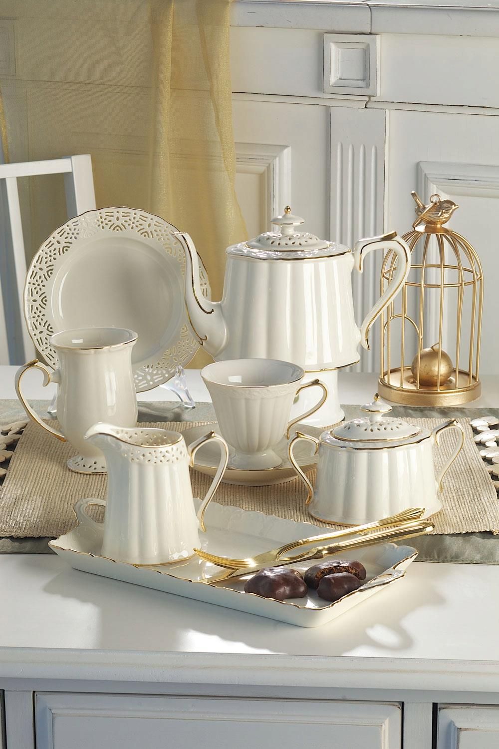 Porcelanowy serwis do herbaty na 6 osób - Clara Gold Ivory Serwis do kawy lub herbaty o unikatowym kształcie, z kolekcji porcelany w śmietankowym odcieniu bieli i klasycznym fasonie. Niezwykle elegancki serwis do herbaty lub kawy wyróżnia się wysmukłym kształtem naczyń, podkreślonym delikatnym tłoczeniem oraz misterną, ażurową koronką, wykonaną ręcznie. Lekkości i uroku dodaje kolekcji ręcznie malowana złota linia na obrzeżach naczyń oraz stopki filiżanek i kubeczków. W zestawie znajduje się porcelanowa taca, doskonała jako talerz do ciasta. Clara Gold Ivory to rozpoznawalny fason Villa Italia w nowej odsłonie kolorystycznej. Dawny, zdecydowany kremowy odcień został zastąpiony nowym, jaśniejszym odcieniem śmietankowej bieli. Serwis do herbaty lub kawy i cała zastawa Clara Gold Ivory nada wyjątkowy charakter każdemu spotkaniu przy stole. Skład serwisu do kawy i herbaty: 6 filiżanek 180 ml do kawy/ herbaty i 6 spodków pod filiżanki 6 talerzyków deserowych 19 cm 1 dzbanek do herbaty o pojemności 850 ml 1 cukiernica 1 mlecznik 1 talerz do ciasta prostokątny 30 x 14,5 cm Szczegóły: materiał: porcelana kolor: bardzo jasny kremowy ażurowy wzór złota linia ręcznie dekorowany dla 6 osób elementów: 22