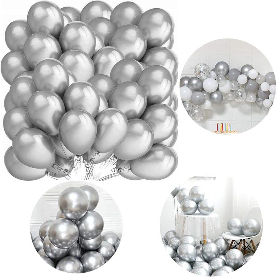 Balony metaliczne na ślub, urodziny Balon 100szt Zestaw Srebrne SPECYFIKACJA Kolor: srebrny Opakowanie zawiera 100szt Rozmiar po napompowaniu: 30x63cm WSPANIAŁY DODATEK DO WYSTROJU Balony w srebrnym kolorze są po prostu idealne do wszystkich potrzeb związanych z dekoracją przyjęcia. Balony będą doskonałym dodatkiem na urodziny, rocznicę ślubu, zaręczyny, imprezę firmowa, przyjęcie z okazji ukończenia szkoły, a nawet romantyczną randkę z ukochaną osobą. Zostały wykonane z najwyższej jakości latexu, co sprawia, że są trwałe, piękne, a jednocześnie całkowicie bezpieczne dla dzieci! Idealne do tworzenia girland, bram, dekoracji sufitów czy ścian na każdą okazję.
