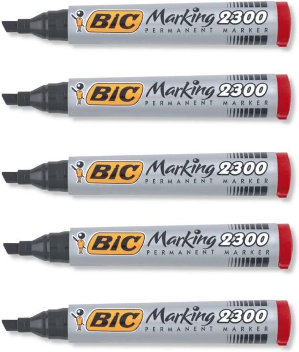 Marker Permanentny Bic Czerwony, Ścięta Końcówka 5 szt ​Tusz na bazie alkoholu, bezzapachowy Bez skuwki nie wysycha przez 3 tygodnie Zablokowana końcówka nie ugina się i nie cofa pod naciskiem Długość linii pisania 1100 m Ścięta końcówka Grubość linii pisania 3,1- 5,3 mm