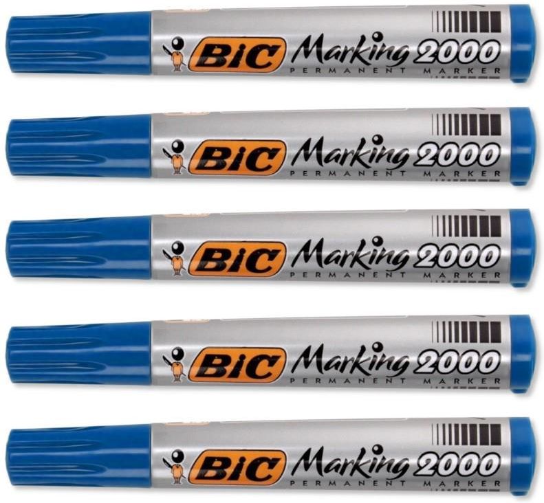 Marker Permanentny Bic Niebieski Okrągła Końcówka 5szt​ Tusz na bazie alkoholu, bezzapachowy Bez skuwki nie wysycha przez 3 tygodnie Zablokowana końcówka nie ugina się i nie cofa pod naciskiem Długość linii pisania dla końcówki okrągłej 1400 m, dla ściętej 1100 m Okrągła końcówka. Średnica 5,5 mm, grubość linii pisania 1,7 mm