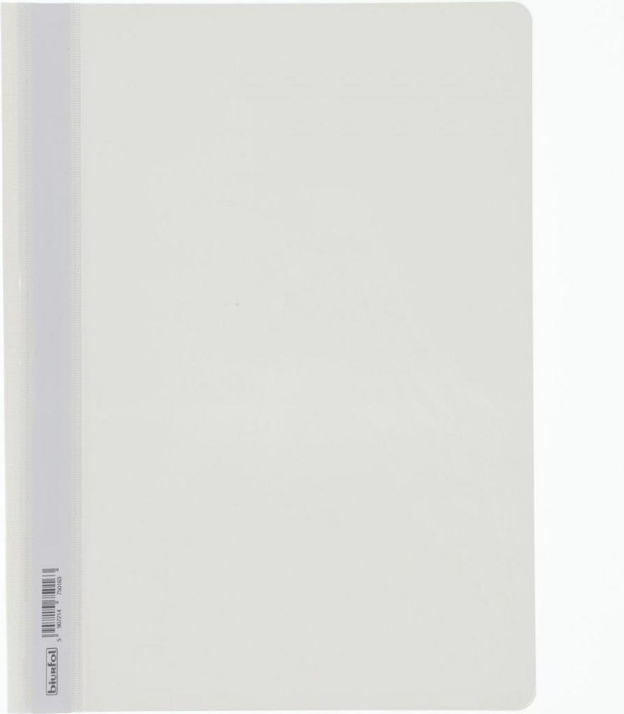 Folia PVC, przód twardy przezroczysty, tył twardy kolorowy, w środku blaszka i wąs o długości 16,5 cm, umożliwiający wpięcie dokumentów do 2 cm, wymienny, papierowy pasek do opisu, dwa wycięcia ułatwiające wysuwanie paska. W formacie A4 zaokrąglone rogi obu okładek. Kolor biały. Opakowanie zawiera 20 sztuk.