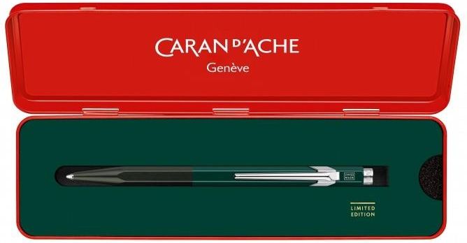 Długopis szwajcarskiej marki Caran d’Ache z kolekcji 849 – kolekcja limitowana Wonder Forest. Caran d'Ache jest źródłem twórczej inspiracji od ponad 100 lat. Celebruje okres świąteczny z oryginalną kolekcją „Wonder Forest”. Jest to magiczna propozycja upominków składająca się z pięciu kultowych produktów firmy, przygotowanych w nowej odsłonie na tę właśnie okazję w kolorach wyrażających jej „szwajcarską” tożsamość. Ponadczasowość czerwieni spotyka się z nowoczesnością ciemnej zieleni – lasu, który jest domem dla cennych, świątecznych skarbów. Kultowy długopis 849 z sześciokątnym aluminiowym korpusie. Pierwszy model 849 o dwóch różnych sposobach wykończenia korpusu: Lekki i wytrzymały, lakierowany dwoma kolorami, z wykończeniem zarówno matowym jak i błyszczącym. Dolna część jest wykończona poprzez obróbkę elektrochemiczną, natomiast górna część (pod klipsem) jest lakierowana. Długopis posiada przyciskowy mechanizm wysuwu wkładu. Wyposażony w bardzo pojemny wkład długopisowy Goliath niebieski M, który pozwoli nam na zapisanie 600 stron A4. Długopis umieszczony jest w specjalnym czerwonym piórniku.