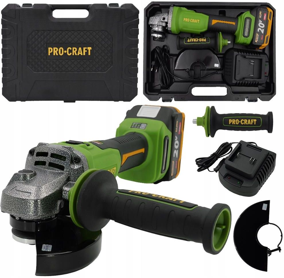 BEZSZCZOTKOWA AKUMULATOROWA SZLIFIERKA KĄTOWA Firmy: PROCRAFT Kod produktu: PWA220 Charakterystyka produktu Wydajna szlifierka kątowa z bezszczotkowym silnikiem i funkcją soft startu. Posiada dwuzakresową regulację prędkości (3500/6000/8000 obr./min), obsługuje tarcze 125 mm i gwint M14. Idealna do cięcia i szlifowania bez dostępu do zasilania sieciowego. Szlifierka z możliwością zmiany regulacji prędkości i zamontowania dodatkowej rączki w 3 pozycjach. Parametry Napięcie akumulatora, typ: 20 V DC, Li-ion Typ silnika: Bezszczotkowy Prędkość obrotowa bez obciążenia: 3500/6000/8000 min⁻¹ Maks. średnica tarczy: 125 mm Gwint wrzeciona: M14 Soft start: Tak Regulacja obrotów: Tak Masa urządzenia: 2,1 kg Masa zestawu: 4 kg W zestawie: szlifierka kątowa akumulatorowa PWA220, akumulator 4Ah 1 szt., ładowarka, osłona tarczy, rękojeść boczna, tarcze mocujące(1 kpl.), klucz specjalny, walizka.
