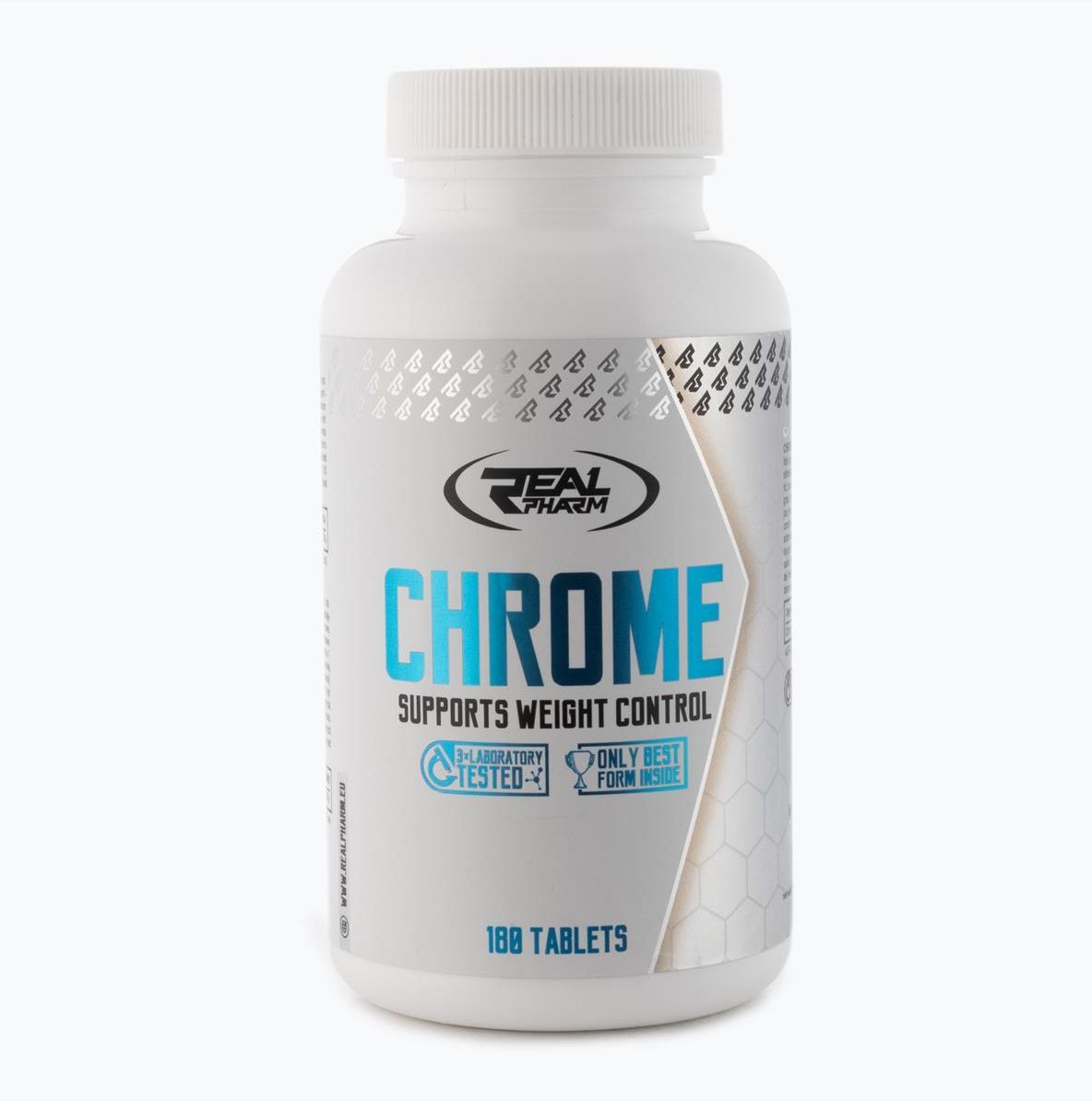 Real Pharm Chrome Chrom 180tab. Chrom należy do pierwiastków niełatwych w pozyskaniu z diety w odpowiednich ilościach, stąd szczególnie osoby prowadzące intensywny tryb życia często cierpią na jego niedobory. Preparat jest odpowiedzią na zwiększone zapotrzebowanie na chrom, który stanowi ważny element kontrolowania poziomu cukru we krwi w naszym organizmie, hamuje apetyt i wspomaga gubienie tkanki tłuszczowej. Zastosowanie: suplementacja chromu pomaga zachować kontrolę nad masą ciała i sprzyja utracie tkanki tłuszczowej, co jest ważne podczas odchudzania i redukcji chrom obecny w diecie pomaga zapobiegać licznym przewlekłym chorobom serca, cukrzycy itp. suplementacja chromu wpływa pozytywnie na poziom glukozy we krwi chrom odgrywa ważną rolę w metabolizowaniu tłuszczu – pozwala zapanować nad poziomem cholesterolu chrom zmniejsza apetyt na węglowodany – jemy mniej cukrów prostych suplementacja chromu pomaga zmniejszać masę tłuszczową, sprzyja zwiększaniu chudej masy mięśniowej i może prowadzić do utraty masy ciała chrom sprzyja insulinooporności Dawkowanie: Przyjmować porcję – 1 tabletka, raz dziennie popijając wodą.