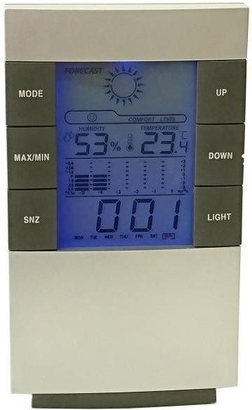 Wielofunkcyjny termohigrometr z zegarem i kalendarzem (dniami tygodnia) Funkcje: - Zegar i kalendarz (dni tygodnia) oraz budzik z funkcj drzemki - Graficzna prognoza pogody - Termometr i higrometr wewntrzny - Wskanik komfortu klimatycznego - Pami min/max - Przebieg zmian temperatury z ostatnich 12 …