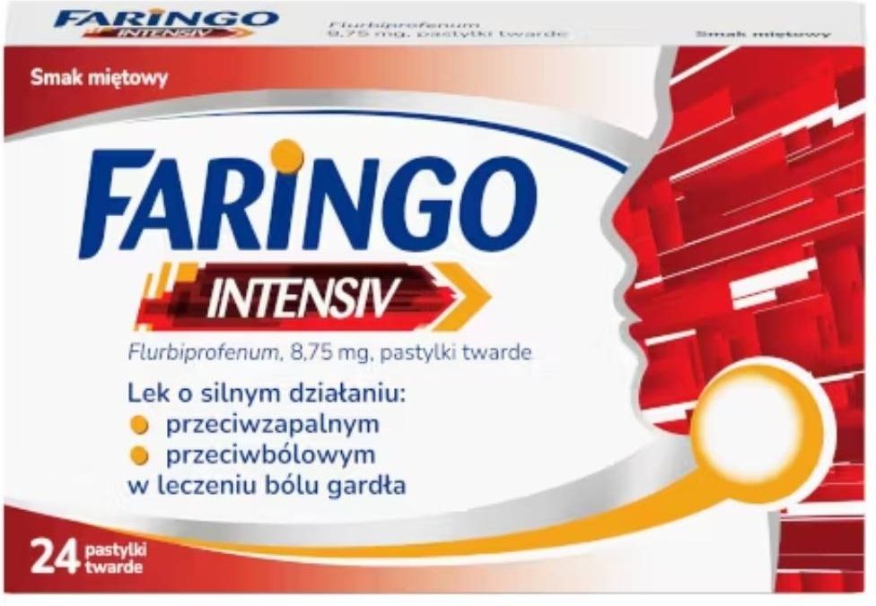 Lek Faringo Intensiv zawiera flurbiprofen. Substancja ta należy do grupy leków nazywanych niesteroidowymi lekami przeciwzapalnymi (NLPZ). Leki te działają poprzez zmianę odpowiedzi organizmu na ból, obrzęk i wysoką temperaturę. Wskazania do stosowania: Lek Faringo Intensiv jest stosowany w krótkotrwałym łagodzeniu objawów bólu gardła takich jak podrażnienie, ból i obrzęk gardła oraz trudności w przełykaniu, u dorosłych i młodzieży w wieku powyżej 12 lat. Jeśli po upływie 3 dni nie nastąpiła poprawa lub pacjent czuje się gorzej, należy zwrócić się do lekarza. Skład: Substancją czynną leku jest flurbiprofen. Jedna pastylka twarda zawiera 8,75 mg flurbiprofenu. Pozostałe składniki leku to: Sacharoza, Glukoza ciekła, Makrogol 300, Olejek eteryczny miętowy, Lewomentol, Potasu wodorotlenek. Działanie: Faringo Intensiv działa przeciwbólowo na gardło. Dawkowanie: Lek Faringo Intensiv należy zawsze przyjmować dokładnie tak, jak to opisano w tej ulotce dla pacjenta lub zgodnie z zaleceniami lekarza lub farmaceuty. W razie wątpliwości należy zwrócić się do lekarza lub farmaceuty. Zalecana dawka to: dorośli i młodzież w wieku powyżej 12 lat: 1 pastylka twarda co 3-6 godzin, w razie potrzeby. Nie należy stosować więcej niż 5 pastylek na dobę. Po przyjęciu 1 pastylki, należy ją ssać powoli, rozpuszczając w jamie ustnej. Podczas rozpuszczania należy zmieniać położenie pastylki w jamie ustnej. Stosowanie u dzieci: Nie należy podawać leku Faringo Intensiv w postaci pastylek twardych dzieciom w wieku poniżej 12 lat. Lek Faringo Intensiv przeznaczony jest wyłącznie do krótkotrwałego stosowania. Należy stosować najmniejszą skuteczną dawkę przez najkrótszy okres niezbędny do złagodzenia objawów. W przypadku infekcji należy niezwłocznie skonsultować się z lekarzem lub farmaceutą, jeśli objawy (takie jak gorączka i ból) utrzymują się lub nasilają. W przypadku wystąpienia podrażnień w jamie ustnej należy przerwać stosowanie flurbiprofenu. Nie należy stosować leku Faringo Intensiv przez okres dłuższy niż 3 dni, o ile lekarz nie zaleci inaczej. Jeśli nie ma poprawy lub nastąpiło pogorszenie, lub jeśli pojawiły się nowe objawy, należy skontaktować się z lekarzem lub farmaceutą. Niezwłocznie skontaktować się z lekarzem lub farmaceutą lub udać się do najbliższego szpitala. Objawy przedawkowania mogą obejmować: nudności lub wymioty, ból brzucha, dużo rzadziej biegunkę. Możliwe jest również wystąpienie szumu w uszach, bólu głowy i krwawienia z przewodu pokarmowego. W razie jakichkolwiek dalszych wątpliwości związanych ze stosowaniem tego leku, należy zwrócić się do lekarza lub farmaceuty. Działania niepożądane: Jak każdy lek, lek ten może powodować działania niepożądane, chociaż nie u każdego one wystąpią. Należy przerwać stosowanie tego leku i natychmiast skontaktować się z lekarzem, jeśli wystąpią poniższe objawy: objawy reakcji alergicznych, takie jak astma, nieoczekiwany świszczący oddech lub duszność, świąd, zapalenie błony śluzowej nosa (katar), wysypka skórna, itp. obrzęk twarzy, języka lub gardła powodujący trudności w oddychaniu, przyśpieszone bicie serca i spadek ciśnienia krwi prowadzący do wstrząsu (mogą one wystąpić nawet podczas pierwszego zastosowania leku). ciężkie reakcje skórne takie jak łuszczenie się, tworzenie pęcherzy lub odwarstwianie skóry. Jeśli wystąpi którykolwiek z następujących objawów lub wystąpią jakiekolwiek objawy niewymienione w ulotce, należy powiedzieć o tym lekarzowi lub farmaceucie. Pozostałe działania niepożądane, które mogą wystąpić: Często (mogą wystąpić u mniej niż 1 na 10 pacjentów): zawroty głowy, ból głowy - podrażnienie gardła owrzodzenia w jamie ustnej lub ból w jamie ustnej ból gardła dyskomfort lub nietypowe odczucia w jamie ustnej (np. uczucie pieczenia lub ciepła w ustach, mrowienia, kłucia, itp.) nudności i biegunka uczucie mrowienia i swędzenia skóry Niezbyt często (mogą wystąpić u mniej niż 1 na 100 pacjentów): senność ospałość lub trudności w zasypianiu nasilenie astmy, świszczącego oddechu, trudności w oddychaniu - tworzenie pęcherzy w jamie ustnej i gardle, drętwienie gardła suchość w jamie ustnej uczucie pieczenia w jamie ustnej , zaburzenia smaku, wzdęcia, ból brzucha, gazy, zaparcia, niestrawność, wymioty zmniejszenie czucia w gardle gorączka, ból wysypka skórna, świąd skóry Rzadko (mogą wystąpić u mniej niż 1 na 1000 pacjentów): reakcja anafilaktyczna Częstość nieznana (nie może być określona na podstawie dostępnych danych): anemia, trombocytopenia (niska liczba płytek we krwi, mogąca powodować powstawanie siniaków i krwawienia) obrzęk (opuchlizna) wysokie ciśnienie krwi niewydolność lub atak serca ciężkie postacie reakcji skórnych takie jak zmiany pęcherzowe, w tym zespół Stevensa-Johnsona, zespół Lyella (toksyczne martwicze oddzielnie się naskórka) zapalenie wątroby. Interakcje: Należy powiedzieć lekarzowi lub farmaceucie o wszystkich lekach stosowanych przez pacjenta obecnie lub ostatnio, a także o lekach, które pacjent planuje stosować, również tych, które wydawane są bez recepty. W szczególności należy powiadomić lekarza, jeśli pacjent przyjmuje: kwas acetylosalicylowy (z wyjątkiem małych dawek, do 75 mg na dobę, zaleconych przez lekarza) leki obniżające ciśnienie lub stosowane w niewydolności serca (przeciwnadciśnieniowe, glikozydy nasercowe) leki moczopędne (diuretyki, włączając leki oszczędzające potas) leki rozrzedzające krew (przeciwzakrzepowe, przeciwpłytkowe) leki stosowane w leczeniu dny moczanowej (probenecyd, sulfinpirazon) inne NLPZ lub kortykosteroidy (np. celekoksyb, ibuprofen, diklofenak sodowy lub 3 prednizolon) mifepryston (lek stosowany w celu farmakologicznego zakończenia ciąży) antybiotyki chinolonowe (takie jak cyp