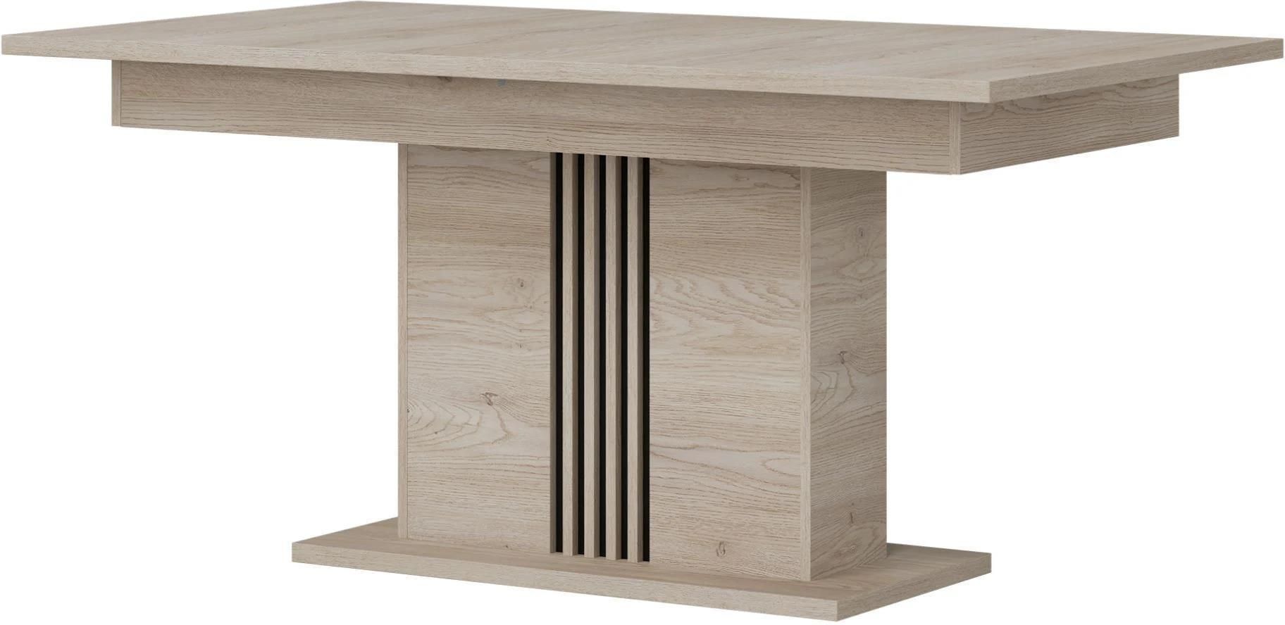 Stół rozkładany prostokątny do jadalni i salonu Dąb Lamele Loft MATI ST12 MATI ST12 Stół rozkładany ST12 to elegancki mebel, który świetnie sprawdzi się w przestrzeni jadalni i salonu, łącząc ponadczasowe wzornictwo z praktycznymi rozwiązaniami. Dzięki innowacyjnemu mechanizmowi rozkładania, z łatwością dostosujesz jego rozmiar do aktualnych potrzeb – idealny zarówno na codzienne posiłki, jak i na większe spotkania rodzinne czy przyjęcia. Mati ST12 wyróżnia wyrafinowane zestawienie kolorystyczne ciepłego dębu cremona cotta i czerni, co stanowi idealne połączenie nowoczesnego designu z klasycznym stylem. Ciekawym akcentem są pionowe żłobienia na kolumnie, które dodają całości unikalnego charakteru. Każdy element stołu zaprojektowano z myślą o tym, aby spełnić najwyższe standardy jakości, zapewnić maksymalny komfort i wrażenia estetyczne. Wysokiej jakości płyta laminowana Stół rozkładany Kolekcja Mati składa się z 19 segmentów Wymiary Szerokość: 90 cm Długość: 160 cm Długość po rozłożeniu: 200 cm Wysokość: 76,5 cm Waga towaru z opakowaniem: 72,75 kg Rozkładanie Stół rozłożysz szybkim sposobem za pomocą prowadnicy synchronicznej – wystarczy pociągnąć za jeden koniec blatu, a drugi rozłoży się w tym samym czasie. Ukryta pod blatem jedna wkładka pozwala zwiększyć rozmiar z 160 cm do 200 cm – taki stół pomieści nakrycia nawet dla dziesięciu osób. Wykończenie Mebel został precyzyjnie wykonany z solidnej płyty wiórowej pokrytej laminatem w kolorze dąb cremona cotta z dodatkiem czarnych akcentów. Zastosowany materiał jest łatwy w pielęgnacji i utrzymaniu czystości, a także odporny na zarysowania i uszkodzenia, co gwarantuje długotrwałe użytkowanie produktu. Szczegóły produktu Nazwa kolekcji: mati Kod / symbol producenta: st12 Styl: nowoczesny Ilość wkładek: 1 Rozkładany: tak Nóżki: ślizgacz Ilość paczek produktu: 3 Wyposażenie: instrukcja montażu / akcesoria montażowe Montaż: do samodzielnego montażu Bryła uniwersalna: tak (lewostronna / prawostronna) Wykonanie Korpus: płyta wiórowa laminowana16 mm / MDF 16 mm Blat korpusu: płyta wiórowa laminowana 16 mm Podstawa korpusu: płyta wiórowa laminowana16 mm Półka: płyta wiórowa laminowana 16 mm Front: płyta wiórowa laminowana 16 mm Kolorystyka Korpus: dąb cremona cotta / czarny Nóżki: czarny Galeria zdjęć