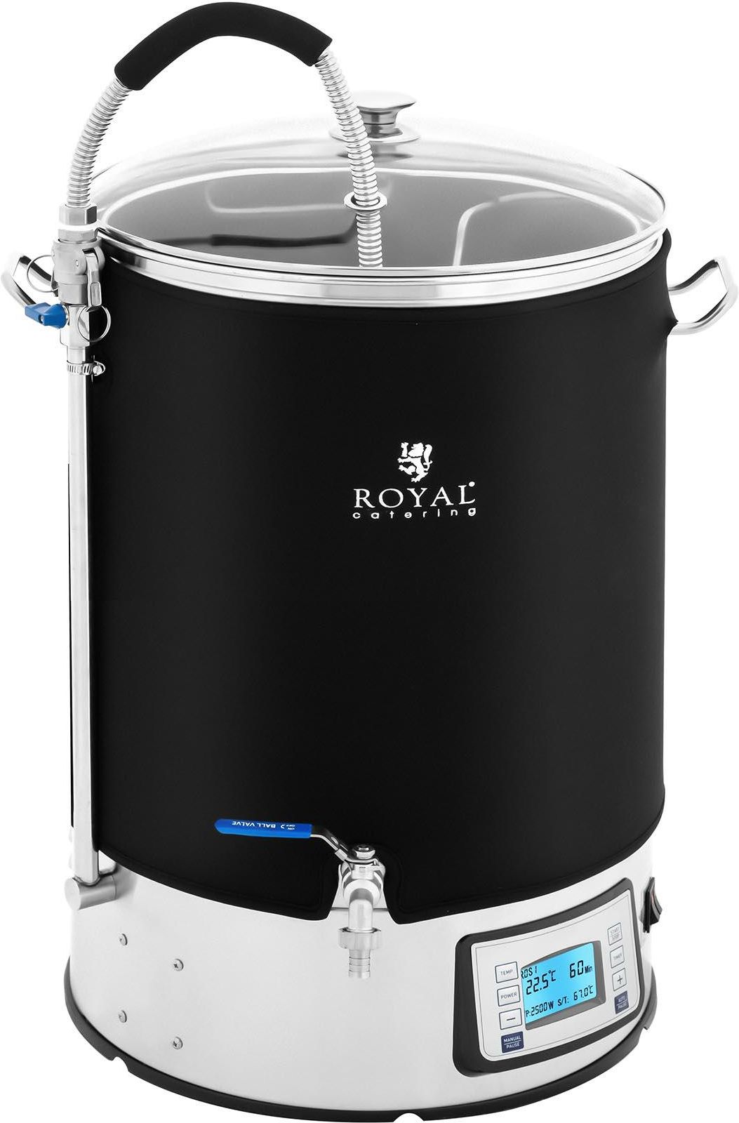 Kocioł warzelny zacierny do produkcji piwa brzeczk Royal Catering Kod producenta: 10012888 Kocioł warzelny marki Royal Catering pozwala produkować piwa, ciemne, pszeniczne czy pilzneńskie. Kocioł wykonany został ze stali nierdzewnej, jest trwały i łatwy w czyszczeniu. Posiada pojemność 40 l. Podziałka w litrach pozwala na precyzyjne odmierzanie składników. Płytka drukowana reguluje ustawienia programu, dzięki czemu proces warzenia zawsze przebiega precyzyjnie. Sterowanie odbywa się za pomocą panelu dotykowego z czytelnym wyświetlaczem LCD. Do wyboru jest obsługa automatyczna oraz ręczna. Funkcja pamięci pozwala zapisać do 9 przepisów. Funkcja automatycznej pauzy umożliwia uwolnienie aromatów i smaków. Element grzewczy posiada moc 2500 W i jest regulowany trzypoziomowo: 0-2500 W. Temperatura regulowana jest w zakresie 10-100°C. Izolacja kotła zapewnia energooszczędność. Napędzana magnetyczna pompa miesza zacier, a później pierwszą brzeczkę. Podwójne dno zapobiega przywieraniu zacieru. Kran spustowy ze zintegrowanym filtrem pozwala łatwo przelać brzeczkę. Boczne uchwyty ułatwiają przenoszenie. Urządzenie wyposażone zostało w zabezpieczenie przed przegrzaniem. Cechy produktu: - Pojemność 40 l, - Tryb automatyczny i pamięć do 9 przepisów, funkcje idealne dla początkujących piwowarów, - Wyświetlacz LCD do ustawienia temperatury, mocy i czasu warzenia, - Element grzewczy regulowany w trzech poziomach: 0-2500 W, - Łatwe mycie dzięki zastosowaniu wysokiej jakości stali nierdzewnej. Parametry techniczne: - Nr katalogowy - 10012888 - Stan artykułu - Nowy - Model - RCBM-40IN - Napięcie [V] - 230 - Materiał - Stal nierdzewna, Szkło hartowane - Moc [W] - 2500 - Pojemność [l] - 40 - Pamięć - 9 receptur - Typ wyświetlacza - LCD - Minutnik - zakres czasu - 0-180 min - Zakres regulacji temperatury [°C] - 10-100 - Zakres regulacji mocy ogrzewania [W] - 0-2500 - Liczba elementów grzejnych - 2 - Minutnik - Tak - Kranik spustowy - Tak - Tryb automatyczny - Tak - Tryb wstrzymania automatycznego - Tak - Tryb ręczny - Tak - Uchwyty boczne - Tak - Fałszywe dno - Tak - Pompa magnetyczna - Tak - Funkcja memory - Tak - Pomiar aktualnej temperatury - Tak - Personalizacja przepisów - Tak - Wymiary (DxSxW) [cm] - 45 x 45 x 69 - Waga [kg] - 11,6 - Wymiary wysyłki (DxSxW) [cm] - 69 x 47 x 46 - Waga wysyłki [kg] - 14,7 W zestawie: - Kocioł warzelny - Pompa - Zbiornik wewnętrzny z uchwytem - Podwójne dno - Rura - Filtr - Oznaczenie pojemności - Płaszcz izolacyjny - Instrukcja Kod producenta: 1016080 Kod producenta: 10012888 Kocioł warzelny marki Royal Catering pozwala produkować piwa, ciemne, pszeniczne czy pilzneńskie. Kocioł wykonany został ze stali nierdzewnej, jest trwały i łatwy w czyszczeniu. Posiada pojemność 40 l. Podziałka w litrach pozwala na precyzyjne odmierzanie składników. Płytka drukowana reguluje ustawienia programu, dzięki czemu proces warzenia zawsze przebiega precyzyjnie. Sterowanie odbywa się za pomocą panelu dotykowego z czytelnym wyświetlaczem LCD. Do wyboru jest obsługa automatyczna oraz ręczna. Funkcja pamięci pozwala zapisać do 9 przepisów. Funkcja automatycznej pauzy umożliwia uwolnienie aromatów i smaków. Element grzewczy posiada moc 2500 W i jest regulowany trzypoziomowo: 0-2500 W. Temperatura regulowana jest w zakresie 10-100°C. Izolacja kotła zapewnia energooszczędność. Napędzana magnetyczna pompa miesza zacier, a później pierwszą brzeczkę. Podwójne dno zapobiega przywieraniu zacieru. Kran spustowy ze zintegrowanym filtrem pozwala łatwo przelać brzeczkę. Boczne uchwyty ułatwiają przenoszenie. Urządzenie wyposażone zostało w zabezpieczenie przed przegrzaniem. Cechy produktu: - Pojemność 40 l, - Tryb automatyczny i pamięć do 9 przepisów, funkcje idealne dla początkujących piwowarów, - Wyświetlacz LCD do ustawienia temperatury, mocy i czasu warzenia, - Element grzewczy regulowany w trzech poziomach: 0-2500 W, - Łatwe mycie dzięki zastosowaniu wysokiej jakości stali nierdzewnej. Parametry techniczne: - Nr katalogowy - 10012888 - Stan artykułu - Nowy - Model - RCBM-40IN - Napięcie [V] - 230 - Materiał - Stal nierdzewna, Szkło hartowane - Moc [W] - 2500 - Pojemność [l] - 40 - Pamięć - 9 receptur - Typ wyświetlacza - LCD - Minutnik - zakres czasu - 0-180 min - Zakres regulacji temperatury [°C] - 10-100 - Zakres regulacji mocy ogrzewania [W] - 0-2500 - Liczba elementów grzejnych - 2 - Minutnik - Tak - Kranik spustowy - Tak - Tryb automatyczny - Tak - Tryb wstrzymania automatycznego - Tak - Tryb ręczny - Tak - Uchwyty boczne - Tak - Fałszywe dno - Tak - Pompa magnetyczna - Tak - Funkcja memory - Tak - Pomiar aktualnej temperatury - Tak - Personalizacja przepisów - Tak - Wymiary (DxSxW) [cm] - 45 x 45 x 69 - Waga [kg] - 11,6 - Wymiary wysyłki (DxSxW) [cm] - 69 x 47 x 46 - Waga wysyłki [kg] - 14,7 W zestawie: - Kocioł warzelny - Pompa - Zbiornik wewnętrzny z uchwytem - Podwójne dno - Rura - Filtr - Oznaczenie pojemności - Płaszcz izolacyjny - Instrukcja Kod producenta: 1016080 Royal Catering