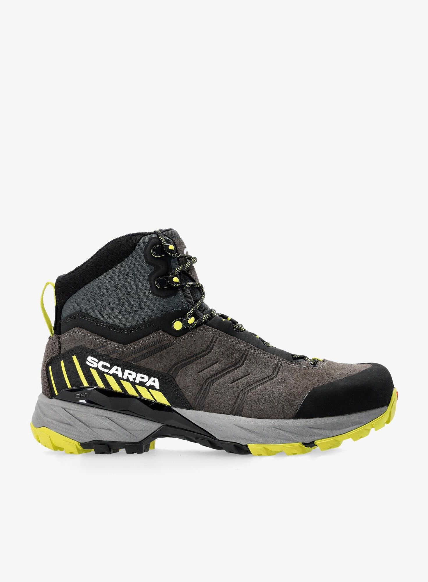 Buty trekkingowe wysokie Scarpa Rush TRK GTX - titanium/lime to połączenie niskiej wagi, komfortu oraz funkcjonalności, które dotrzyma Ci koku podczas niewymagających hikingów, czy bardziej technicznych trekkingów w wymagających warunkach. Buty trekkingowe wysokie Scarpa Rush TRK GTX - titanium/lime swtorzono w oparciu o wysokiej jakości cholewkę, wykonaną ze skóry zamszowej o grubości 1,7-1,9 mm. Jest odporna na uszkodzenia, a także zachowuje naturalną oddychalność. Zastosowanie kołnierza Autofit 3D zwiększa komfort noszenia oraz zapewnia bezpieczeństwo podczas poruszania się w wymagającym, technicznym terenie. Bardzo ważnym elementem budowy modelu jest obecność membrany GORE-TEX® Extended Comfort. Dzięki niej nie musisz obawiać się przemoczenia podczas opadów deszczu. Standardowy system wiązania butów pozwoli Ci na perfekcyjne dopasowanie ich do własnych preferencji, a długi język i podwyższony stan buta zapobiegnie przedostawaniu się nieczystości do jego wnętrza. Podeszwa tego modelu to Presa® TRK-01, która posiada solidny bieżnik zapewniający doskonałą przyczepność w zróżnicowanym terenie. Specjalna technologia IKS (Interactive Kinetic System) zapewnia dodatkową amortyzację i przyczepność poprzez zastosowanie specjalnych stref w podeszwie, które kompresują się pod wpływem nacisku na podłoże, równocześnie umożliwiając kontakt dodatkowych kostek bieżnika z podłożem. Pozwala tym samym na spędzenie wielu godzin na szlaku przy mniejszym zmęczeniu stóp. Buty Scarpa Rush TRK GTX - titanium/lime – najważniejsze cechy:Doskonale spiszą się podczas szybkich wypadów trekkingowych;Cholewka wykonana ze skóry zamszowej;Kołnierz Autofit 3D, który maksymalizuje komfort użytkowania butów i zwiększa bezpieczeństwo podczas poruszania się w trudnym technicznie terenie;Membrana GORE-TEX® Extended Comfort Footwear zadba nie tylko ochronę przed wodą, ale zapewni również odpowiedni poziom oddychalności;Standardowy system wiązania za pomocą sznurowadeł;Długi język i podwyższony stan buta zapobiegnie przedostawaniu się nieczystości do jego wnętrza;Podeszwa Presa® TRK-01 z gumy SuperGum zapewniająca doskonałą przyczepność;Technologia IKS (Interactive Kinetic System) zapewnia dodatkową amortyzację i zwiększoną przyczepność;