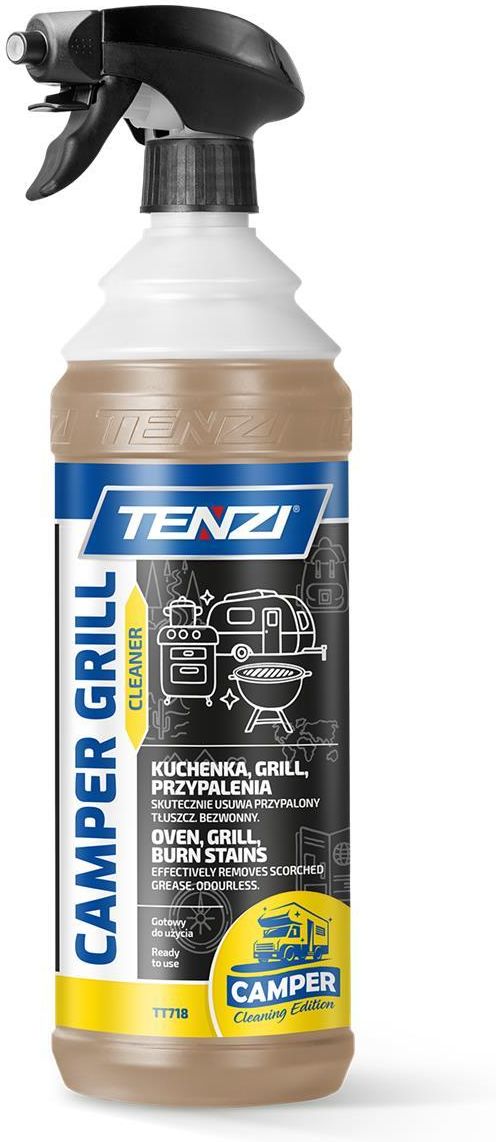 TENZI CAMPER GRILL CLEANER 1 L Preparat do bieżącego czyszczenia grilli, piecyków, piekarników oraz rusztów Gotowy do użycia preparat do bieżącego czyszczenia grilli, piecyków, piekarników oraz rusztów, oparty na niejonowych związkach powierzchniowo czynnych. Skutecznie usuwa przypalone resztki jedzenia i tłuste zanieczyszczenia, pozostawiając powierzchnie idealnie czyste i gotowe do ponownego użycia. Dzięki bezzapachowej formule jest komfortowy w użyciu, zapewniając higieniczną czystość bez nieprzyjemnych oparów. Idealny dla każdego, kto chce szybko i bez wysiłku zadbać o swoje urządzenia kuchenne. Gotowy do użycia preparat do bieżącego czyszczenia grilli, piecyków, piekarników oraz rusztów to innowacyjny środek, który dzięki swojej zaawansowanej formule opartej na niejonowych związkach powierzchniowo czynnych, skutecznie radzi sobie z przypalonymi resztkami jedzenia i tłustymi zabrudzeniami. To idealne rozwiązanie dla osób ceniących sobie efektywność i komfort w czyszczeniu kuchennych urządzeń, ponieważ preparat pozostawia powierzchnie idealnie czyste i gotowe do ponownego użycia, bez potrzeby dodatkowego szorowania czy trudnych do usunięcia pozostałości. Jego bezzapachowa formuła sprawia, że jest niezwykle komfortowy w użytkowaniu, co pozwala na higieniczne czyszczenie bez ryzyka nieprzyjemnych oparów, co jest częstym problemem przy używaniu agresywnych środków czyszczących. Uwagi do użycia: Nanieść na zabrudzoną powierzchnię w postaci piany lub mgiełki. Zmyć gąbką, zmywakiem lub druciakiem. Do mycia i płukania używać czystej bieżącej wody pitnej, najlepiej gorącej. Wytrzeć i w razie potrzeby natłuścić. Sposób użycia: Preparat należy stosować na nie nagrzaną powierzchnię. Równomiernie rozprowadzić preparat po całej powierzchni. Pozostawić na 2-5 minut. Szorować do uzyskania właściwego efektu. Spłukać obficie wodą. Wytrzeć szmatką do sucha. W razie potrzeby powtórzyć proces.