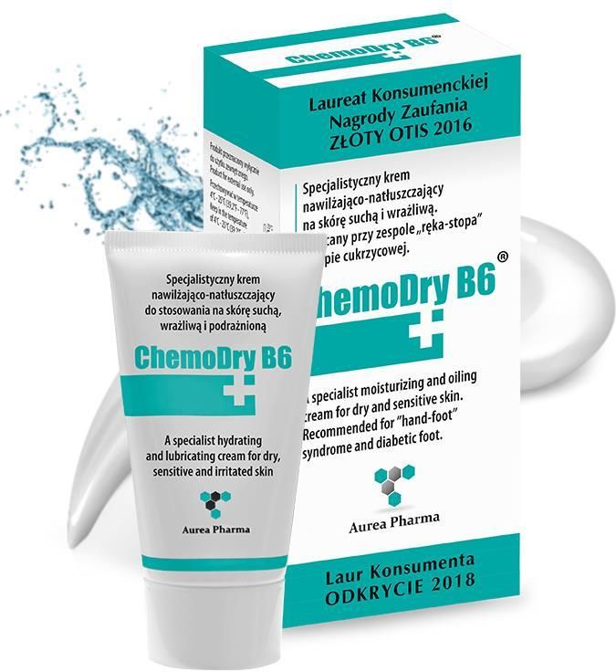 OPIS PRODUKTU ChemoDry B6 to specjalistyczny krem nawilżająco – natłuszczający do stosowania na skórę suchą i wrażliwą. Zalecany jest również pacjentom przyjmującym chemioterapię z objawami zespołu „ręka-stopa” oraz przy stopie cukrzycowej. SKŁAD Aqua, Olea Europea Fruit Oil, Caprylic/Capric …