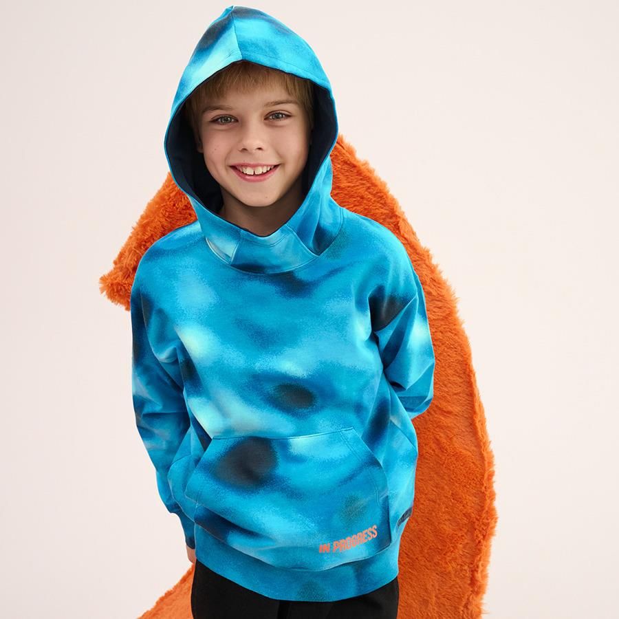 Bluza z kapturem dla chłopca: obniżona linia ramion Materiał i technologie: 60% bawełna, 38% poliester, 2% elastan (280 g/m2) certyfikat Oeko-Tex Standard 100 Pranie i pielęgnacja: Prać w temperaturze do 40 °C, proces łagodny. Nie bielić. Nie suszyć w suszarce bębnowej. Prasować w temperaturze do 150 °C. Nie czyścić chemicznie. Prać i prasować po lewej stronie. Nie prasować ozdób. Prać z p..