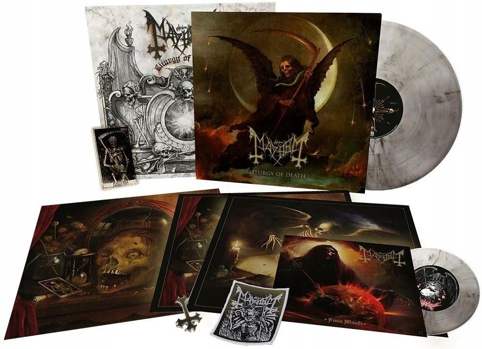 Marmurkowa przezroczysto-czarna płyta winylowa 12” 180g z 12-stronicową książeczką LP, metalowa przypinka w kształcie odwróconego krzyża zespołu Mayhem, naszywka, 2 grafiki, karta tarota „Liturgy of Death” Z ich nowym dziełem Liturgy of Death, MAYHEM potwierdza swój status najbardziej …