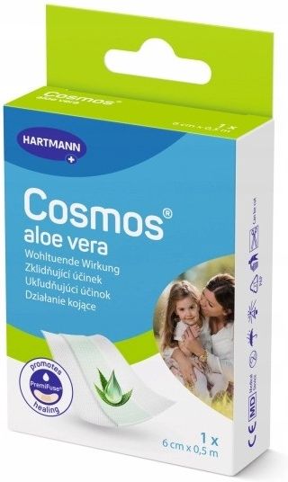 Opis: Cosmos Aloe Vera 6 cm x 0,5 m, elastyczny, oddychający i delikatny dla skóry plaster z opatrunkiem Cosmos Aloe Vera 6 cm x 0,5 m to wyrób medyczny do cięcia. Plaster z opatrunkiem nasączonym ekstraktem z aloesu, który koi, łagodzi podrażnienia i wspomaga regenerację skóry. Elastyczny, oddychający i delikatny dla skóry, wspomaga proces gojenia..Skład: Plaster do cięcia z 1,5% wyciągiem z aloesu..Charakterystyka produktu: Jakie właściwości plaster z opatrunkiem 6 cm x 0,5 m Cosmos Aloe Vera? Plaster do stosowania na niewielkie rany i skaleczenia z opatrunkiem nasączonym ekstraktem z aloesu: wspomaga proces gojenia ekstrakt z Aloe Vera koi łagodzi podrażnienia jest elastyczny i oddychający, delikatny dla skóry nie przykleja się do rany, dzięki temu przy zmianie plastra rana nie zostaje uszkodzona hydrofobowy, oznacza to, że nie nasiąka podczas mycia i dzięki temu chroni ranę przed potencjalnie zanieczyszczoną wodą łatwy do cięcia na dowolną długość. .Sposób użycia: Jak stosować Cosmos Aloe Vera, plaster z opatrunkiem, 6 cm x 0,5 m? Plaster na drobne rany i skaleczenia: oczyść i delikatnie osusz skórę wokół rany dopasuj wielkość opatrunku odetnij potrzebną długość przyklej plaster w miejscu rany zmieniaj w miarę potrzeby. .Zawartość opakowania: Plaster 6 cm x 0,5 m, 1 sztuka.Dodatkowe: Przechowywać w suchym miejscu w temperaturze pokojowej, poza zasięgiem dzieci. .Ostrzeżenia: To jest wyrób medyczny. Używaj go zgodnie z instrukcją używania lub etykietą..
