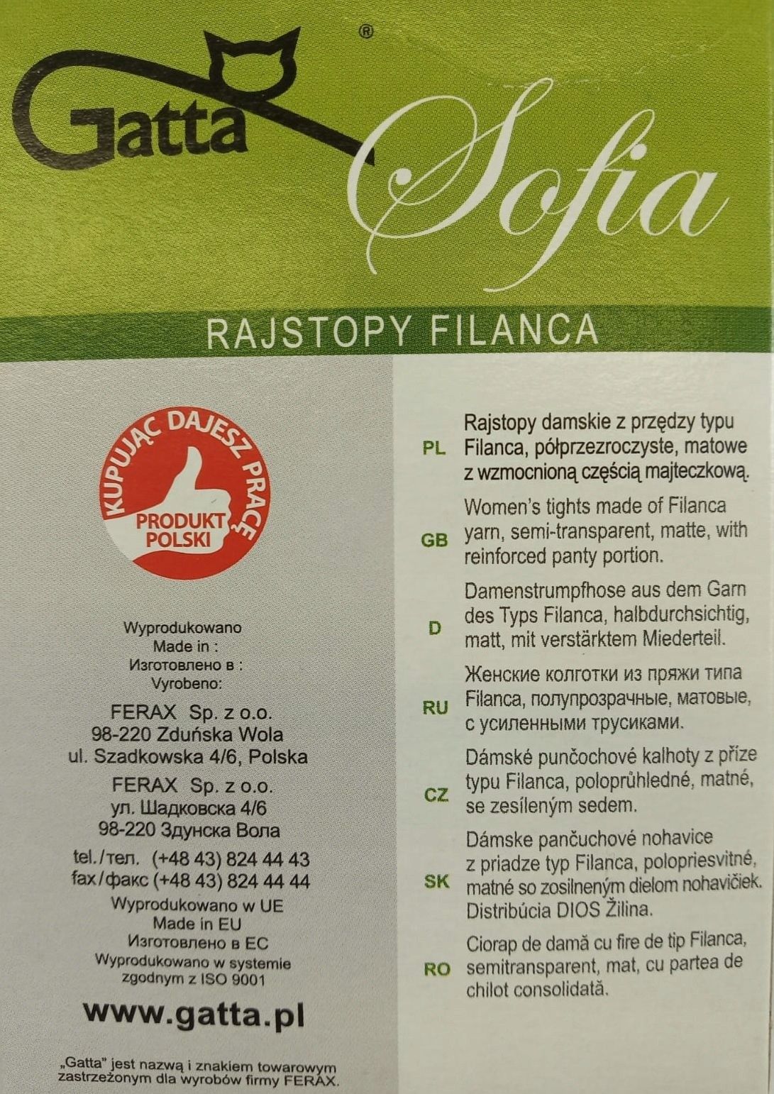 Gatta Sofia Rajstopy Filanca 6-XXL Golden 20den Gatta Sofia Rajstopy Filanca 6-XXL Golden 20den – elegancja i komfort dla pełniejszych kształtów Gatta Sofia Rajstopy Filanca 6-XXL Golden 20den to wyjątkowy produkt stworzony z myślą o kobietach, które pragną połączyć stylowy wygląd z wygodą. Dzięki półprzezroczystej strukturze i matowemu wykończeniu, rajstopy doskonale podkreślają naturalne piękno nóg. Wykonane z wysokiej jakości przędzy typu filanca (elastil), są trwałe, elastyczne i idealnie dopasowują się do sylwetki. Najważniejsze właściwości Gatta Sofia Rajstop Filanca 6-XXL Golden 20den Przędza typu filanca (elastil) – zapewnia doskonałą elastyczność i wytrzymałość, idealnie dopasowując się do kształtu nóg. Półprzezroczyste, matowe wykończenie – nadaje nogom subtelny i elegancki wygląd, bez niepożądanych refleksów. Grubość 20 DEN – delikatne, ale wystarczająco trwałe, aby podkreślić elegancję nóg i zapewnić komfort noszenia. Wzmocniona część majteczkowa i palce – zwiększają trwałość rajstop, chroniąc je przed szybkim zużyciem i uszkodzeniami. Komfort noszenia – starannie zaprojektowane, aby zapewnić wygodę przez cały dzień, niezależnie od sytuacji. Uniwersalny beżowy kolor – doskonale pasuje do różnych stylizacji, od casualowych po bardziej formalne. Rozmiar 6-XXL – odpowiedni dla wzrostu 170-176 cm i obwodu bioder 128-136 cm, idealny dla kobiet o pełniejszych kształtach. Skład: 96% poliamid, 4% elastan – zapewnia trwałość, elastyczność i komfort użytkowania. Elegancja na co dzień i wyjątkowe okazje Gatta Sofia Rajstopy Filanca 6-XXL Golden 20den to uniwersalny element garderoby, który doskonale sprawdzi się w każdej sytuacji. Ich delikatna struktura i elegancki wygląd sprawiają, że są idealne zarówno do pracy, jak i na specjalne okazje. Wzmocniona konstrukcja zapewnia trwałość, a ich wygoda pozwala cieszyć się pewnością siebie przez cały dzień. Jak nosić i dbać o Gatta Sofia Rajstopy Filanca 6-XXL Golden 20den? Zakładanie: Ostrożnie roluj rajstopy, zaczynając od stopy, a następnie delikatnie naciągaj na nogi, aby uniknąć zaciągnięć. Noszenie: Dopasuj rajstopy równomiernie, aby zapewnić wygodę i estetyczny wygląd. Pranie: Pierz ręcznie w letniej wodzie z delikatnym detergentem, aby zachować ich elastyczność i trwałość. Dlaczego warto wybrać Gatta Sofia Rajstopy Filanca 6-XXL Golden 20den? Gatta Sofia Rajstopy Filanca 6-XXL Golden 20den to doskonałe połączenie jakości, wygody i stylu. Wykonane z przędzy typu filanca, są niezwykle trwałe i elastyczne, co sprawia, że doskonale dopasowują się do sylwetki. Ich elegancki wygląd i komfort noszenia czynią je idealnym wyborem na każdą okazję, zarówno codzienną, jak i wyjątkową. Wybierz Gatta Sofia Rajstopy Filanca 6-XXL Golden 20den i ciesz się elegancją oraz wygodą każdego dnia!