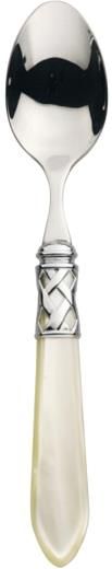 Casa Bugatti ALADDIN IVORY Łyżeczka deserowa Casa Bugatti ALADDIN IVORY Łyżeczka deserowa Ta niezwykle oryginalna, nowoczesna i funkcjonalna łyżeczka deserowa zachwyca nie tylko wyglądem, ale też niezwykłą jakością. Sztućce wykonane są ze stali szlachetnej 18/10 polerowanej i masy akrylowej. Dodatkowo łyżeczka została wykończona ozdobnym chromowanym pierścieniem metalowym. Właściwości: Materiał: stal nierdzewna 18/10, akryl, chromowany metalowy pierścień Można myć w zmywarce do 50/55°C, zalecane mycie ręczne