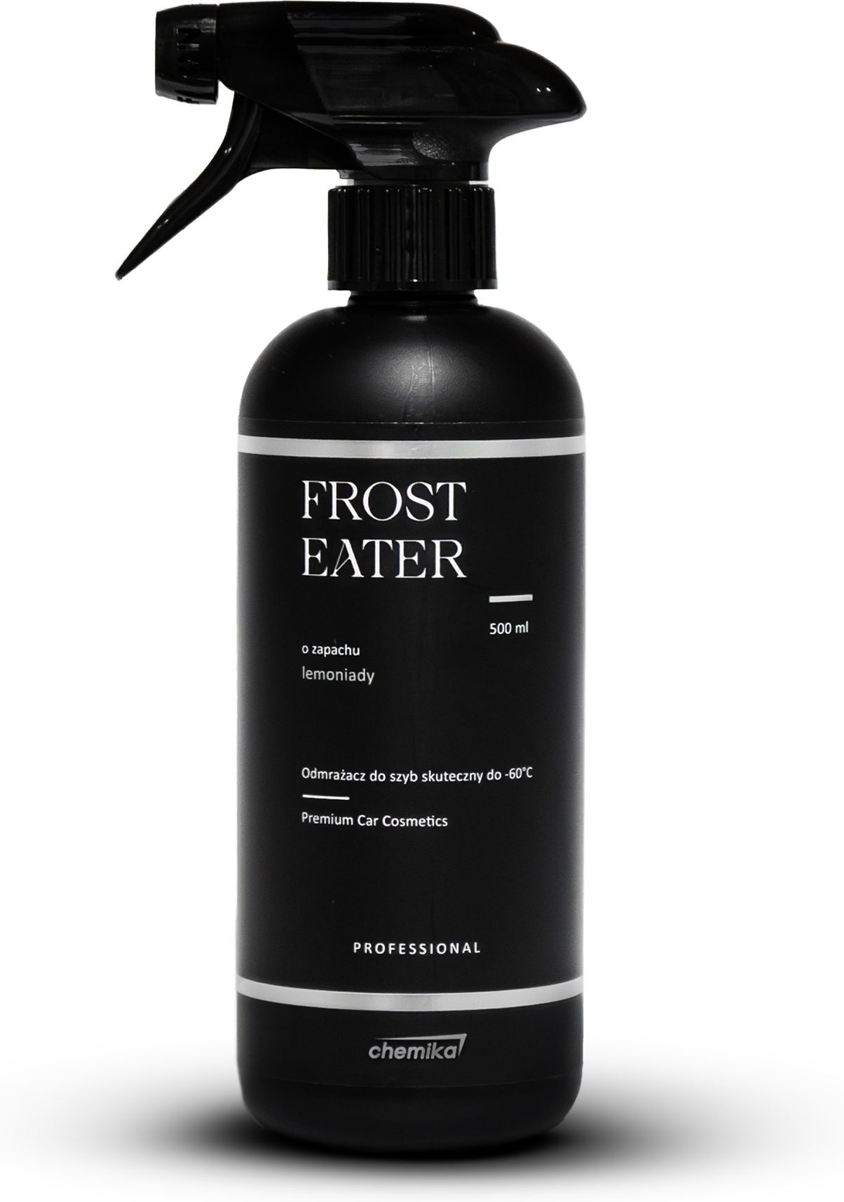 CHEMIKA FROST EATER 500ml Charakterystyka FROST EATER to preparat do szybkiego rozpuszczania lodu i szronu, który ułatwi i przyspieszy każdemu kierowcy przygotowanie auta do jazdy w mroźne, zimowe poranki. Produkt o cytrynowym zapachu jest bezpieczny dla lakieru, szyb, uszczelek oraz piór wycieraczek. Doskonale radzi sobie z oblodzonymi szybami, jest łatwy w aplikacji i nie pozostawia zarysowań na powierzchni w przeciwieństwie do klasycznych skrobaczek. Zabezpiecza powierzchnię przed kolejnym zamarznięciem. Skuteczny nawet w ekstremalnych warunkach pogodowych – działa do -60°C. Przeznaczenie FROST EATER PRO przeznaczony jest do odmrażania szyb i lusterek samochodowych. Sposób użycia Nie rozcieńczać, przed użyciem wstrząsnąć. Należy sprawdzić oddziaływanie na mytą powierzchnię w mało widocznym miejscu. Odgarnąć puchową warstwę śniegu. Rozpylić na oblodzoną powierzchnię szyby, lusterka oraz na wycieraczki. Po roztopieniu lodu usunąć powstałą wodę za pomocą szmatki lub wycieraczek. W razie potrzeby zastosować skrobaczkę. Aby dodatkowo wspomóc usuwanie oblodzeń zaleca się włączyć podgrzewanie przedniej szyby. Uwaga: Nie stosować przy nadwrażliwości na jakiekolwiek składniki preparatu. CHEMIKA FROST EATER to preparat do szybkiego rozpuszczania lodu i szronu, który ułatwi i przyspieszy każdemu kierowcy przygotowanie auta do jazdy w mroźne, zimowe poranki.