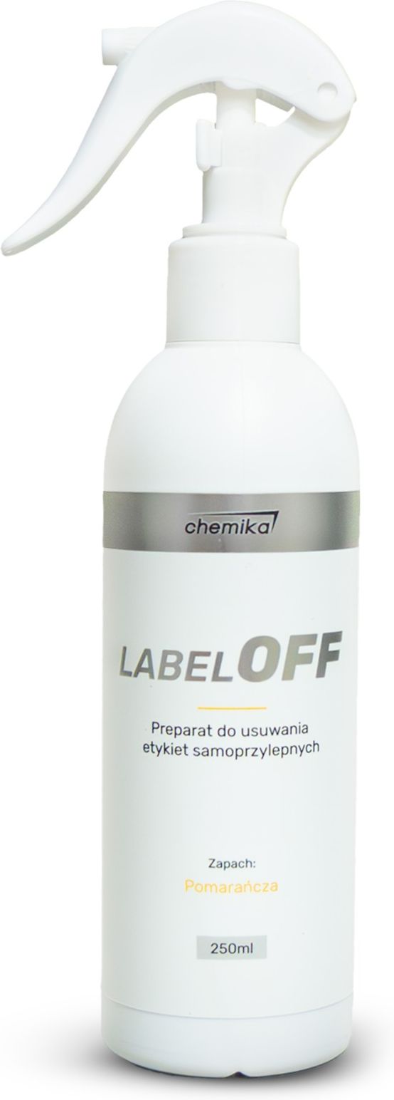 Chemika Label OFF 250ml Charakterystyka Label OFF to profesjonalny preparat do usuwania etykiet samoprzylepnych. Wnika w papier etykietowy i rozpuszcza klej, dzięki czemu etykiety są odklejane za jednym razem, nie pozostawiając żadnych pozostałości. Eliminuje się czasochłonne skrobanie etykiet, oszczędza się podłoże. Label OFF usuwa również lepkie pozostałości wszelkiego rodzaju, takie jak plamy smołowe lub resztki kleju z winiet. Naturalny pomarańczowy zapach sprawia, że praca z nim jest przyjemna. Polecany również jako odplamiacz do tapicerki, wykładzin, dywanów. Przeznaczenie Label OFF przeznaczony jest do usuwania kleju po etykietach, naklejkach, taśmach klejących, resztki gum, atrament, tusz, markery, farby w sprayu, olej, tłuszcz, sadze i inne, z drzwi, okien, szyb, PCV, powierzchni z tworzyw sztucznych w tym poliwęglanu, szkła, ceramiki, kamienia, sprzętu biurowego, AGD i elektronicznego. Sposób użycia Tylko do użytku zewnętrznego. Stosować rękawice ochronne. Produkt gotowy do użycia. Stosować punktowo. Sposób użycia: Nanieść na mytą powierzchnię, odczekać chwilę do momentu zadziałania preparatu, następnie zmyć przy użyciu szmatki. Przed użyciem należy sprawdzić odporność czyszczonej powierzchni na preparat. Przeciwwskazania Nie rozcieńczać. Nie dopuścić do wyschnięcia preparatu na powierzchni. Nie stosować przy nadwrażliwości na jakiekolwiek składniki preparatu. Warunki podczas użytkowania Przed użyciem zapoznać się z etykietą znajdującą się na opakowaniu. Chronić przed dziećmi. W przypadku dostania się do oczu płukać wodą przez kilka minut. Wyjąć soczewki kontaktowe o ile nie są przyklejone do oka. Kontynuować płukanie. W razie połknięcia, niepożądanych reakcji alergicznych, zmian skórnych skonsultować się z lekarzem i pokazać mu etykietę lub Kartę Charakterystyki produktu. Transport Label off należy transportować w oryginalnych szczelnych opakowaniach właściwie zabezpieczonych. Klasyfikowany jest jako materiał niebezpieczny i podlega przepisom transportowym wg RID/ADR (numer rozpoznawczy materiału UN 1993, klasa/kod klasyfikacyjny – 3, grupa pakowania III). W czasie transportu należy utrzymywać temperaturę powyżej 0°C. Nie narażać na długotrwałe działanie niskich temperatur. Chronić przed przegrzaniem oraz działaniem promieni słonecznych. Składowanie Label OFF należy przechowywać w szczelnie zamkniętych, oryginalnych opakowaniach. Składować w pomieszczeniach magazynowych zamkniętych i niedostępnych dla osób niepowołanych. Chronić przed nadmiernym działaniem promieni słonecznych. Nie należy dopuszczać do uszkodzeń mechanicznych opakowań, mogących prowadzić do niekontrolowanego wycieku preparatu. Nie narażać na działanie niskich temperatur. Przechowywać w zakresie temperatur od +5°C do +35°C w pomieszczeniach. Warunki gwarancji Preparat objęty jest 36 miesięczną gwarancją producenta. Gwarancja nie obejmuje opakowań, które zostały uszkodzone mechanicznie na wskutek niewłaściwego obchodzenia się z nimi np: rzucanie, nieostrożny transport. Gwarancja nie obejmuje preparatu zanieczyszczonego chemicznie. Gwarancji nie podlega również preparat, którego wady powstały w wyniku złego sposobu magazynowania wyrobu u odbiorcy. Wymianie podlega preparat, dla którego zostały zachowane warunki pakowania, przechowywania i transportu, a wady uniemożliwiające używania wyrobu zgodnie z jego przeznaczeniem powstały w procesie produkcji i wynikają z winy producenta. Opakowania Label OFF dostępny jest w opakowaniach o pojemności 250 ml lub w innych do uzgodnienia między producentem i odbiorcą. Pojemniki z tworzyw sztucznych. Utylizować zgodnie z krajowymi przepisami. Label OFF to profesjonalny preparat do usuwania etykiet samoprzylepnych. Wnika w papier etykietowy i rozpuszcza klej, dzięki czemu etykiety są odklejane za jednym razem, nie pozostawiając żadnych pozostałości.