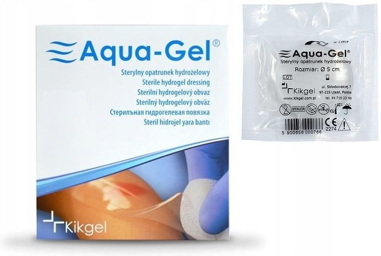 Opatrunek hydrożelowy Kikgel Aquagel krążek Ø 5 cm Aqua-Gel®. Sterylny opatrunek hydrożelowy Kształt: Opatrunek prostotkątny Ø 5 cm Oferta dotyczy 5 szt (opakowanie) Opatrunki hydrożelowe Aqua-Gel® stanowią wodną kompozycję naturalnych oraz syntetycznych polimerów usieciowanych za pomocą wiązki elektronów. Proces radiacyjny zapewnia nie tylko sterylność opatrunku, ale także jego wytrzymałość mechaniczną. Formę użytkową opatrunku stanowi transparentny płat hydrożelu o grubości ok. 3 mm. Zawartość wody w opatrunku Aqua-Gel® wynosi ponad 90%, natomiast polimery wchodzące w jego skład tworzą trójwymiarową, przestrzenną sieć. Tego typu budowa wyróżnia opatrunki hydrożelowe na tle innych opatrunków specjalistycznych i decyduje o jego wyjątkowych cechach: zapewnieniu odpowiedniego poziomu uwodnienia tkanek dzięki właściwościom nawilżającym i jednocześnie absorpcyjnym, działaniu kojącym i uśmierzającym ból, doskonałej elastyczności, pełnej biozgodności. ZASTOSOWANIE oparzenia I-go, II-go oraz III-go stopnia (termiczne, chemiczne, elektryczne) oparzenia słoneczne owrzodzenia odleżyny inne rany przewlekłe (np. stopa cukrzycowa) otarcia, stłuczenia, obrzęki. Zalety gojenia ran w wilgotnym środowisku mniejsze odwodnienie rany oraz zatrzymanie procesu obumierania tkanek, co zapewnia odpowiednie warunki dla neutrofili i fibroblastów biorących udział w gojeniu ran wspomaganie procesu neowaskularyzacji (angiogenezy) wspomaganie autolitycznego oczyszczania rany wspomaganie reepitelializacji, sucha powierzchnia blokuje dostęp krwi oraz składników odżywczych do łożyska rany, co stanowi barierę dla migracji komórek oraz opóźnia epitelializację zmniejszenie bólu – wilgotne łożysko rany izoluje oraz chroni zakończenia nerwowe Sposób aplikacji Aqua-Gel® umieszcza się dowolną stroną na powierzchni rany. Należy stosować opatrunki o wielkości odpowiadającej rozmiarom rany. Opatrunek należy zabezpieczyć przylepcem włókninowym, folią adhezyjną Vellafilm lub bandażem elastycznym. Aqua-Gel® może być stosowany w kompresjoterapii w przypadku owrzodzeń żylnych. Sposób aplikacji opatrunku: Rozerwij torebkę i wyjmij foremkę z opatrunkiem. Trzymając za cienką folię oraz wystający materiał włókninowy wyjmij hydrożel z foremki Zdejmij cienką folię przykrywającą opatrunek Umocuj opatrunek za pomocą przylepca włókninowego, folii poliuretanowej lub bandaża Sposób aplikacji opatrunku: Rozerwij torebkę i wyjmij foremkę z opatrunkiem. Trzymając za cienką folię oraz wystający materiał włókninowy wyjmij hydrożel z foremki Zdejmij cienką folię przykrywającą opatrunek Umocuj opatrunek za pomocą przylepca włókninowego, folii poliuretanowej lub bandaża Zmiana opatrunku W przypadku powierzchownych ran o małym wysięku możliwe jest wydłużenie czasu pozostawania na ranie. Aby zapobiec zbyt szybkiemu wysychaniu opatrunku można umieścić na jego zewnętrznej powierzchni warstwę gazy zwilżonej roztworem soli fizjologicznej (lub położyć dwa opatrunki jeden na drugim) i umocować za pomocą folii poliuretanowej. W sytuacji, gdy doszło już do wysuszenia opatrunku należy pokryć go kompresami z gazy namoczonej solą fizjologiczną, co spowoduje jego spęcznienie i ułatwi zdejmowanie z rany. Przy zmianie opatrunku Aqua-Gel® należy przepłukać ranę roztworem soli fizjologicznej lub preparatem przeznaczonym do dekontaminacji ran np. płynem Microdacyn®. Opatrunki należy zmieniać w zależności od rodzaju rany co 24 – 72 godziny. termin ważności wynosi 2 lata od daty produkcji