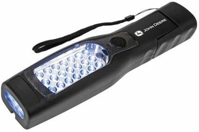 Lampa warsztatowa LED MCXFA1807 John Deere Cechy produktu: wyposażona w 26 diod LED, posiada wskaźnik baterii LED, ma dwa obrotowe haki do zawieszania o 360° do zastosowań bez użycia rąk, trzy magnesy pokryte gumą, dolna część lampy obraca się o 180°, co pozwala na łatwe ustawienie urządzenia na dowolnej powierzchni, odporna na stłuczenie soczewka z poliwęglanu, polimerowa bateria litowo-jonowa (3,7 V 1500 mAh) zapewnia dłuższą żywotność, antypoślizgowa i miękka część zewnętrzna, zestaw zawiera ładowarkę sieciową i samochodową 12V.