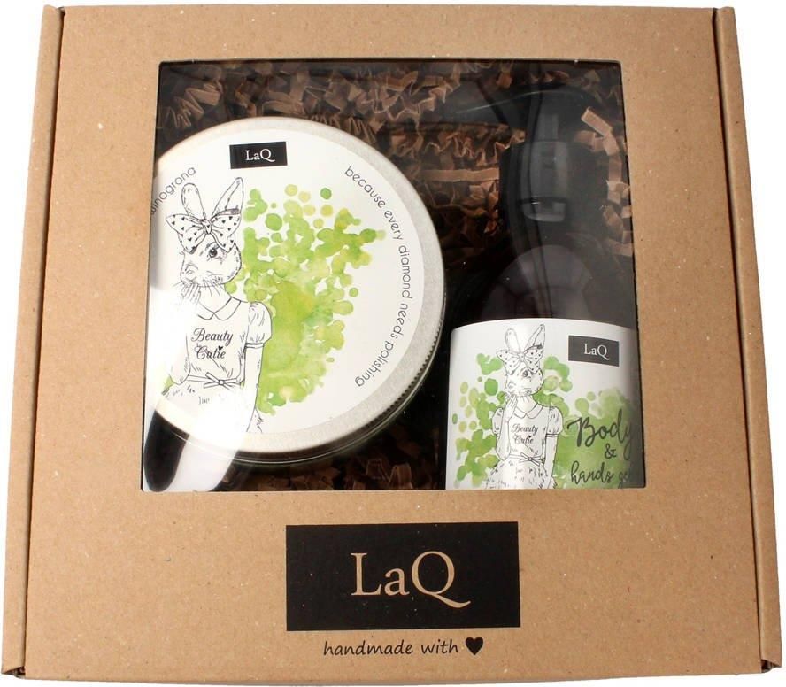 Myjący Peeling do Ciała, Kiwi i Winogrona, Laq, 200ml: Niezwykle słodki peeling do ciała w lekkim, doskonale pieniącym się musie. Zawarty w nim brązowy cukier usunie martwy naskórek i sprawi, że Twoja skóra stanie się doskonale wygładzona. Delikatne substancje myjące doskonale ją oczyszczą. Masło shea, gliceryna roślinna nawilżające ekstrakty z lnu, płatków owsianych i mleka ryżowego nie pozwolą na jej przesuszenie. Ekstrakty z zielonej kawy, cynamonu, imbiru i papryki mają działanie ujędrniające i antycellulitowe. Dzięki peelingowi Twoja skóra stanie się doskonale oczyszczona, gładka i pachnąca. Masło Shea łagodzi skórę, uelastycznia ją i regeneruje. Ma działanie odmładzające dzięki zawartości wielu witamin! Działa ochraniająco i zabezpiecza przed negatywnym wpływem czynników zewnętrznych. Ekstrakt z melona idealnie odświeża, przyspiesza gojenie się ran. Ekstrakt z nasion lnu działa zmiękczająco i intensywnie nawilża naskórek, chroniąc go przed podrażnieniami. Ekstrakt z płatków owsianych działa oczyszczająco i kojąco na skórę, tworzy barierę ochronną. Ekstrakt z mleka ryżowego posiada właściwości zmiękczające i ujędrniające. Ekstrakt z Zielonej Kawy stymuluje przemianę materii w komórkach, działa wyszczuplająco, oczyszczająco, poprawia elastyczność skóry i pomaga usuwać podskórną tkankę tłuszczową. Imbir ma działanie bakteriobójcze, spowalnia procesy starzenia się skóry, odżywia i rewitalizuje skórę. Cynamon ma działanie antybakteryjne, ujędrniające, ściągające i pobudzające krążenie krwi. Rozgrzewa i rozjaśnia skórę. Żel Ujędrniający z Ekstraktem z Kiwi i Winogron, LaQ, 300ml: Potrzebujesz kosmetyku, który łagodnie oczyszcza przy okazji wygładzi i ujędrni naskórek? W taki razie ten żel jest dla Ciebie. Dzięki zawartym ekstraktom kosmetyk wspaniale pielęgnuje, skutecznie ujędrnia i wygładza skórę. Świeży zapach owoców, kiwi i winogrona pozwoli na pełen relaks po ciężkim dniu. Ekstrakt z kiwi przyspiesza proces gojenia ran, chroni skórę przed działaniem wolnych rodników. Ekstrakt z winogrona posiada działanie przeciwstarzeniowe, stymuluje wzrost. Ekstrakt z zielonej kawy to naturalny antyoksydant, posiada właściwości wyszczuplające, usuwa obrzęki i wygładza skórę. Ekstrakt z kory cynamonowca wygładza i ujędrnia naskórek dodatkowo posiada właściwości rozgrzewające. Ekstrakt z korzenia imbiru posiada działanie rozgrzewające i pozwala na zrzucanie zbędnych kilogramów. Ekstrakt z papryki przyspiesza spalanie tkanki tłuszczowej i redukuje cellulit, pobudza krążenie oraz rozgrzewa.
