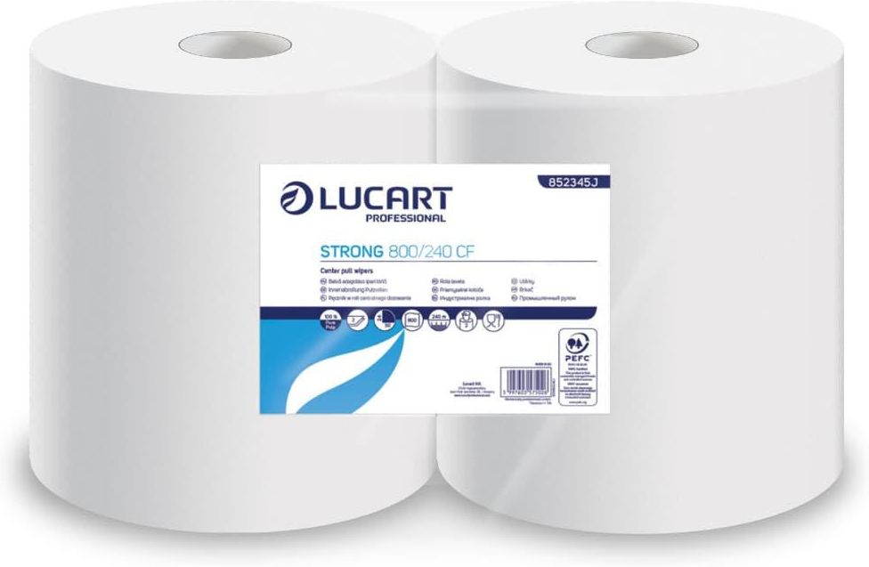 Czyściwo przemysłowe Lucart Strong 800/240CF jest nowym produktem wykonanym z wysokiej jakości celulozy. Produkt jest najlepiej oceniany w stosunku jakości do ceny. Pojedyncza rolka posiada 240 metrów długości, oraz możliwość centralnego dozowania. Czyściwo spełnia wysokie standardy, posiada certyfikat dopuszczający do kontaktu z żywnością, oraz certyfikat PEFC. Materiał - Celuloza Kolor - Biały Ilość warstw - 2 Perforacja - Tak Ilość listków - 800 Wymiary listka - 24cm x 30cm Długość - 240m Wysokość - 24cm Średnica - 250mm Ilość w opakowaniu - 2 szt. Ilość na palecie - 56 szt. Dopuszczenie do kontaktu z żywnością, PEFC